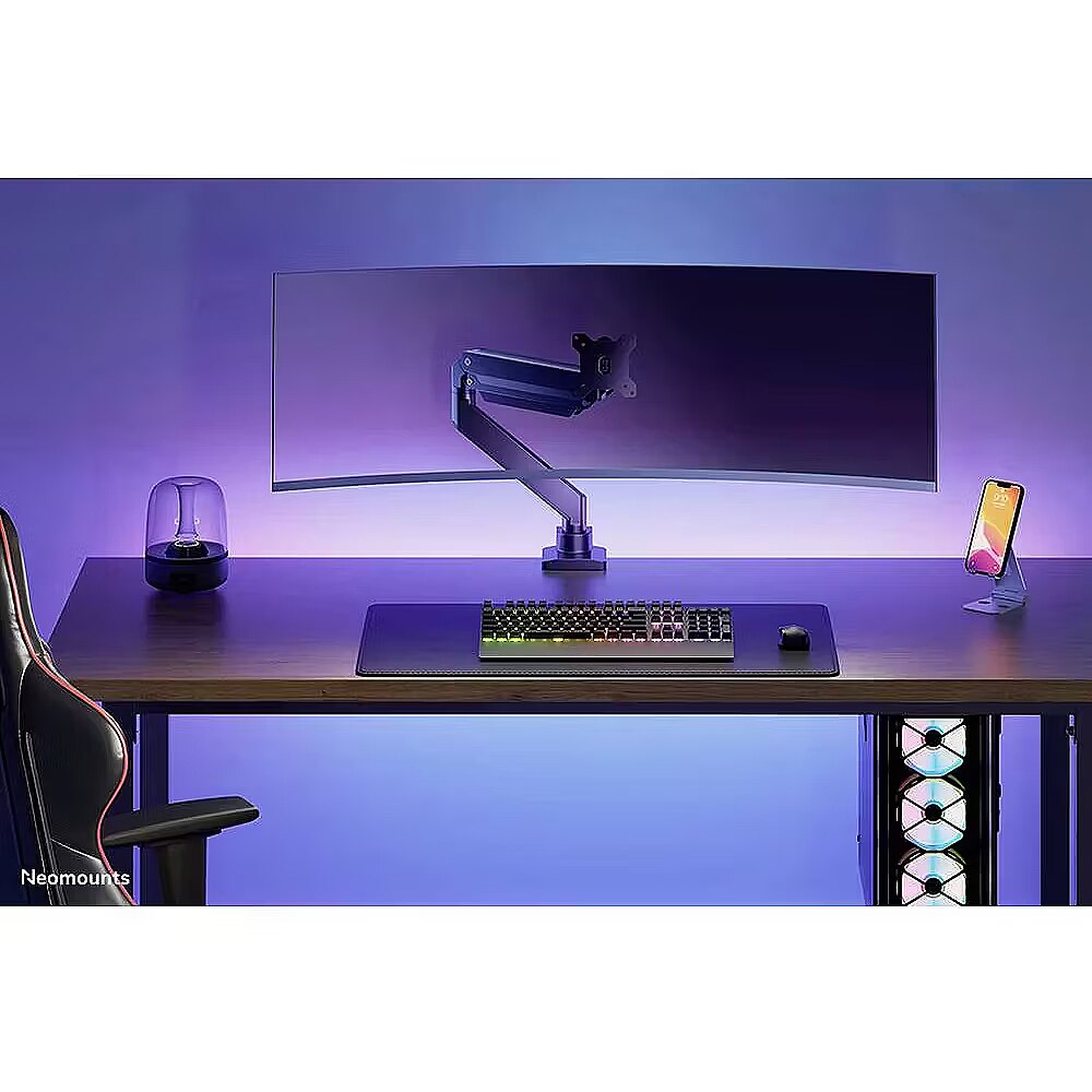 LongDesc - The Neomounts NM-D775BLACKPLUS is a tilt-, swivel and rotatable desk mount for curved screens up to 49". This mount is a great choice for space saving placement on desks using a top-fix desk clamp or grommet mount.The NM-D775BLACKPLUS mounts are specifically designed to support curved screens. They feature a strengthened head for curved screens and are designed to support a higher total capacity up to 49" and a maximum weight of 18 kg. Neomounts unique tilt (180°), rotate (360°) and swivel (180°/ 360°) technology allows the NM-PLUS mounts to change to any viewing angle for optimal use of the capabilities of the ultra-wide screen. The mount is equipped with a 180° stop mechanism. The mounts are easily adjustable in height to 60 centimetres, using a gas spring. Additionally, the mounts are also adjustable in depth, from 0 to 63 centimetres. A unique cable management conceals and routes cables from mount to the ultra-wide screen. The NM-D775BLACKPLUS desk mounts are ideal for use in offices, on counters and in reception areas.All installation material is included with the product.