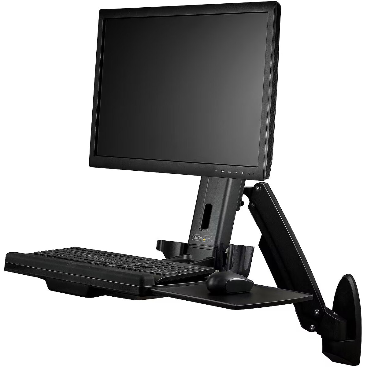 LongSummaryDescription - StarTech.com Wall Mount Workstation - Articulating Full Motion Standing Desk with Ergonomic Height Adjustable Monitor & Keyboard Tray Arm - Mouse & Scanner Holders - Single VESA Display. Product colour: Black, Maximum screen size: 61 cm (24"), Maximum weight capacity: 8 kg. Angle of rotation: 360°, Swivel angle: 90°, Tilt angle range: -5 - 35°. Width: 668 mm, Depth: 800 mm, Height: 500 mm. Package width: 400 mm, Package depth: 580 mm, Package height: 210 mm. Wrench type: Hexagonal wrench, Socket wrench