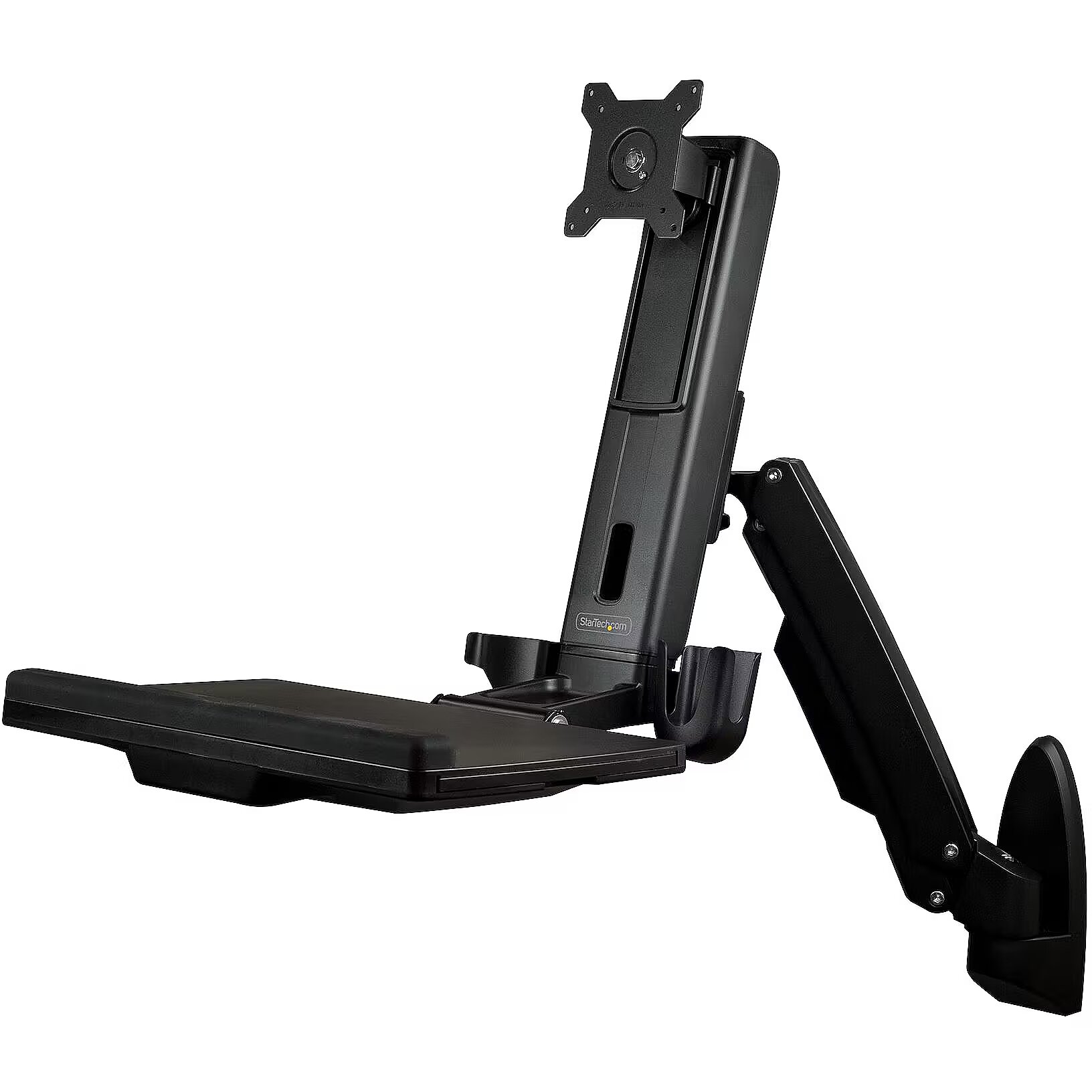 LongDesc - Easily convert your workstation into a standing desk for greater comfort and productivityThis wall-mounted sit-stand desk is perfect for areas that don't have enough space for a traditional sit-stand desk. Its compact, wall-mounted design combines a single-monitor arm and a keyboard tray, with easy height adjustments that let you alternate between sitting and standing without disrupting your workflow.Easy height adjustments, for sitting or standingAdjust your working position in one smooth motion. Simply lift the work surface up to 17.2" (436 mm), to elevate your monitor, keyboard and mouse. The monitor mount has a separate height adjustment of up to 4.9" (124 mm) along the column.Versatile monitor positioningThis sit-stand monitor arm supports one monitor up to 34" (with weight capacity of 17.6 lb./8 kg). Adjust your monitor for ideal viewing with -5° to 35° tilt, or rotate your monitors up to 360° for portrait or landscape orientation.Better utilize your spaceThe sit-stand desk folds back to the wall, and keyboard tray folds up to 90°; saving space when not in use. You can move the swing arm left or right (from -90° to 90°) and lower or raise the arm (from -30° to 65°) to make maximum use of your space.Ample working areaThe monitor arm offers plenty of work space with a large keyboard tray (17.68 x 8.15"/ 449 x 207 mm) and a slide-out tray (8.5 x 8.4" / 217 x 213 mm) that holds your mouse, on the left or right.The WALLSTS1 is backed by a StarTech.com 2-year warranty and free lifetime technical support.The StarTech.com Advantage