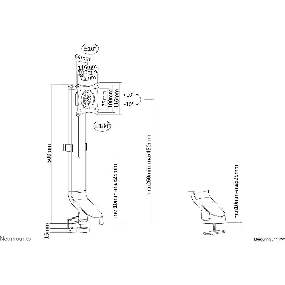LongSummaryDescription - Neomounts FPMA-D860BLACK Monitor arm 10-32". Mounting: Clamp/Grommet, Maximum weight capacity: 8 kg, Minimum screen size: 25.4 cm (10"), Maximum screen size: 81.3 cm (32"), Minimum VESA mount: 75 x 75 mm, Maximum VESA mount: 100 x 100 mm. Height adjustment, Swivel angle range: -10 - 10°, Tilt angle range: -10 - 10°. Product colour: Black