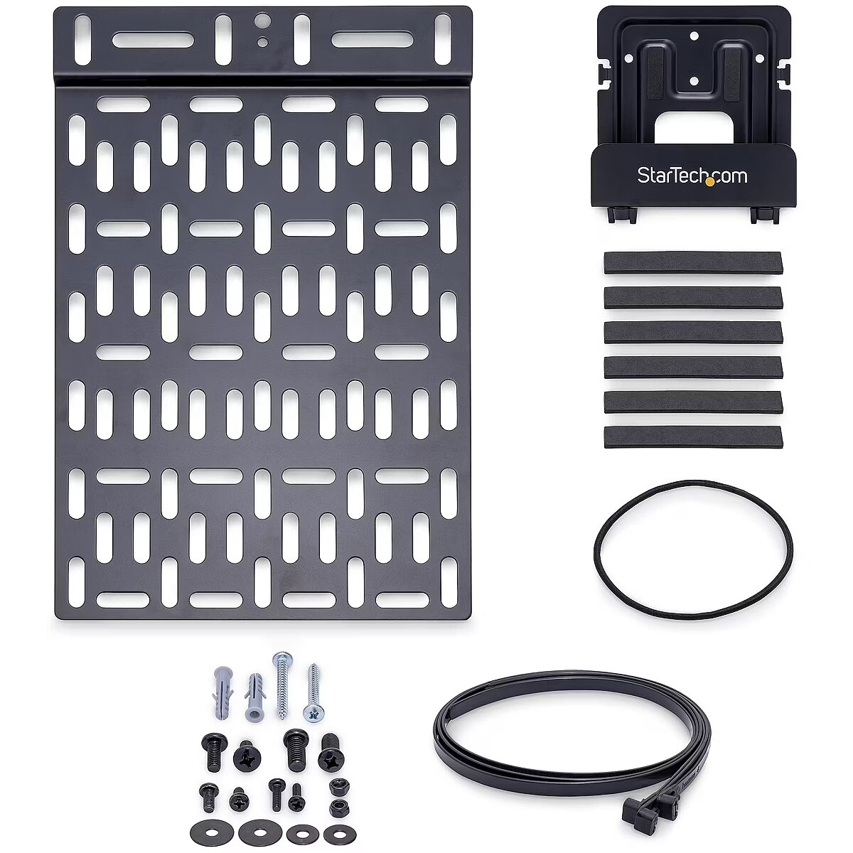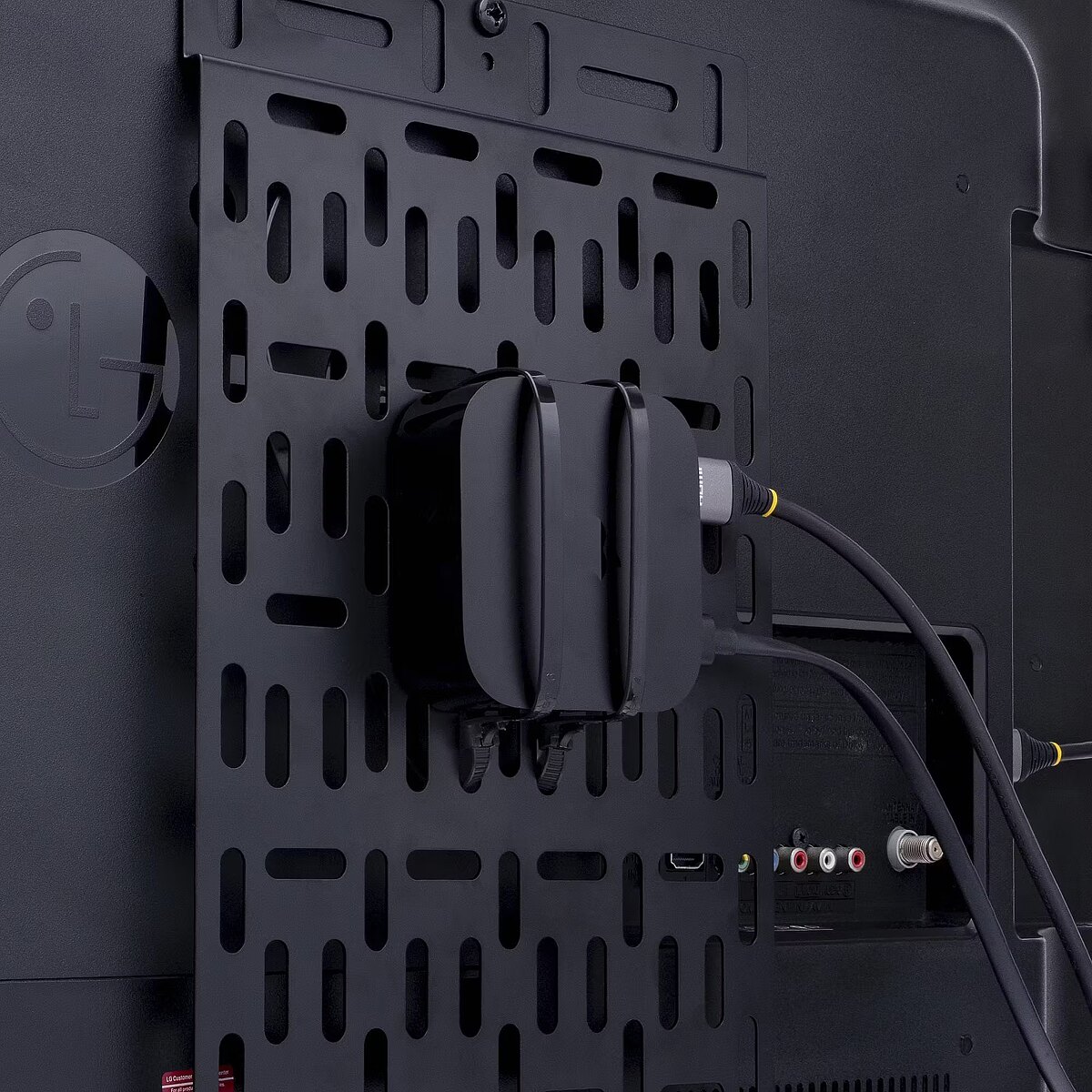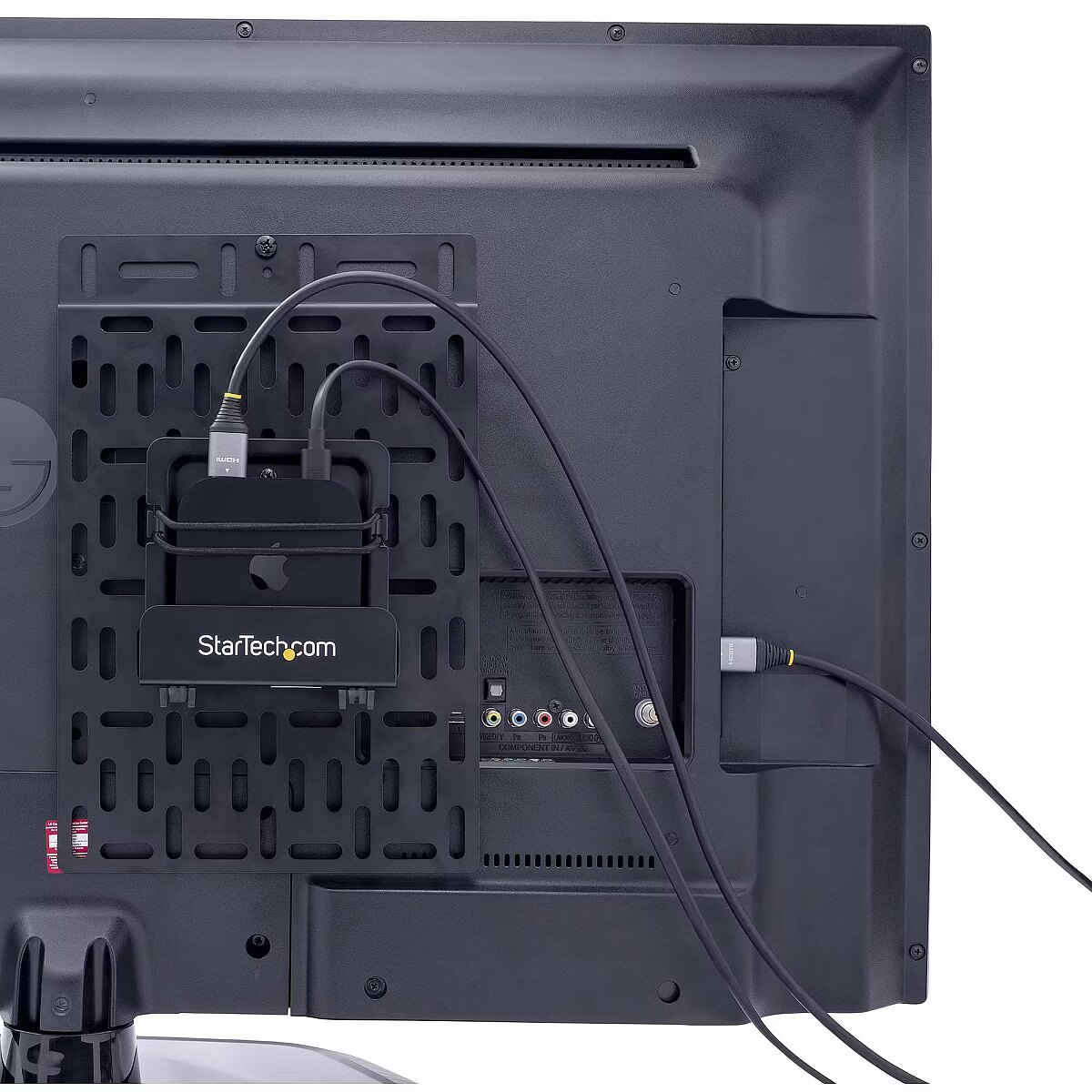 LongDesc - Universal Media Player Mount | Adjustable Cradle | Devices Up to 11 lb. (5 kg)Mount your devices like media players, video extenders or cable boxes to the wall or the back of your TV with this StarTech.com tv accessory mount. Flexible Mounting Options This TV mount bracket offers a variety of mounting options; with a 13.4"x8.8" grid of mounting holes, the bracket can be mounted to a wall or to the back of your TV using VESA screw holes or to a VESA bracket. Store a Variety of Products The media device mount is ideal for devices like media players, Apple TV, video extenders, modems, and cable boxes that can be attached directly to the mounting grid with the included reusable cable ties. For heavier devices (up to 11 lb. / 5 kg) an optional cradle (adjustable depth from 1.8" to 3") is included. The mount also comes with reusable cable ties and an elastic band to help keep your devices secure; and a foam strip to protect your devices from scratches. Hassle-Free Access The open frame design of the mount allows for unrestricted access to your media devices. MDBOXMNT is backed by a StarTech.com 5-year warranty and free lifetime technical support. The StarTech.com Advantage- UNIVERSAL TV ACCESSORY MOUNT: Heavy duty mount for small devices such as media players, Apple TV, video extenders, splitters, modems, routers, network switches & TV cable boxes; Supports 11lb (5kg)- MOUNTING FLEXIBILITY: Mount to the wall or on the back of a TV using the VESA screw holes or to a VESA bracket behind the display; 13.4"x8.8" grid of mounting holes for universal mounting- ADJUSTABLE CRADLE: Hidden small device holder incl. a cradle w/ a durable chassis that has an adjustable depth (1.8-3") to mount heavier devices up to 11lb; Adhesive foam strip incl. to protect device