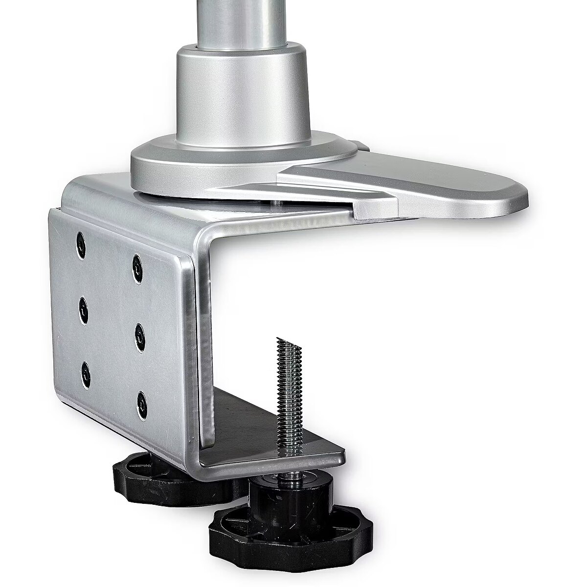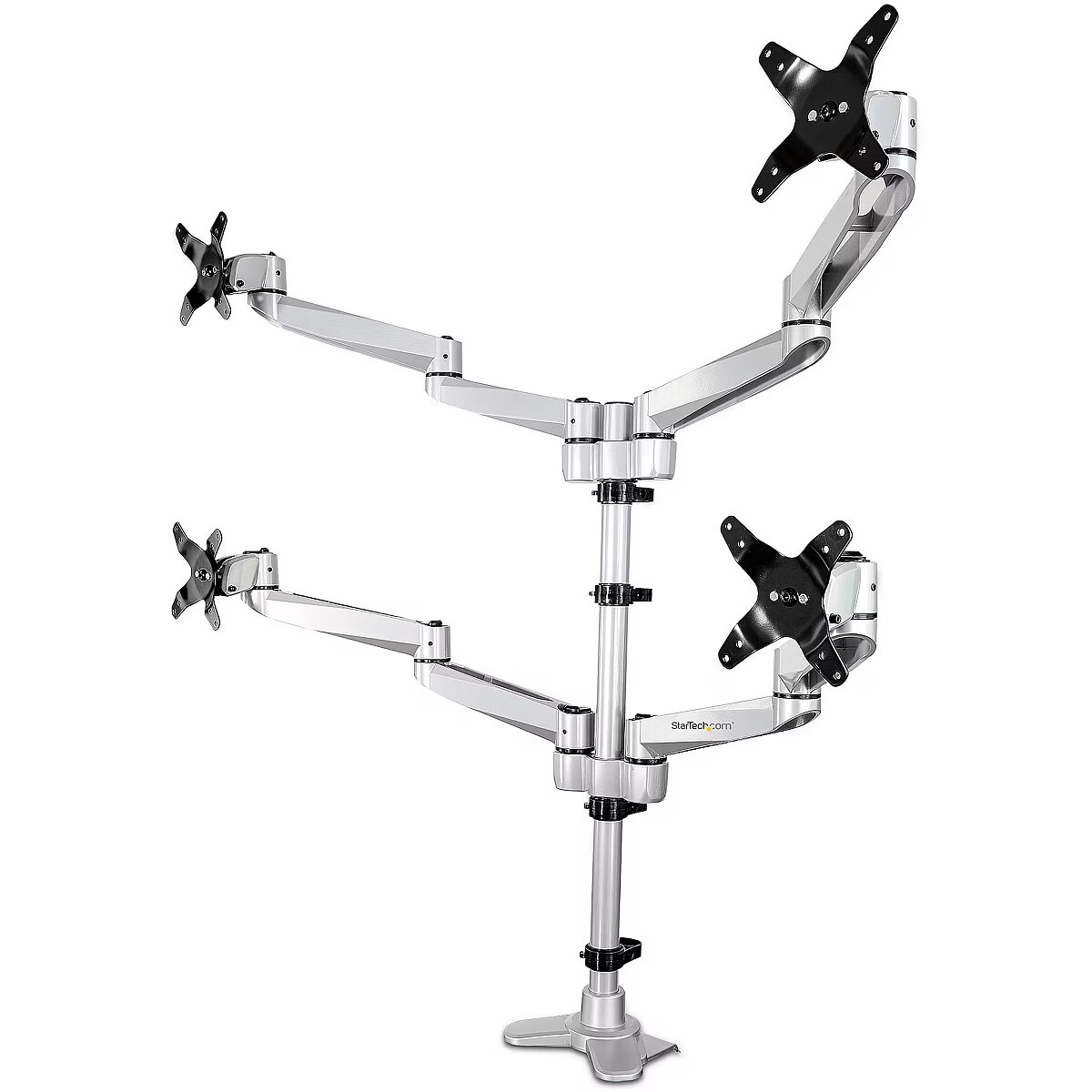 LongDesc - Four Monitor Mount | Desk/Grommet Mount | Tool-less Assembly | For Up to 30" MonitorsCreate a highly productive ergonomic workspace with this premium quad monitor mount, supporting four monitors up to 30" each. Four articulating monitor arms feature dual-swivel action, providing a wide range of motion side to side. The attractive silver finish enhances the aesthetics of your workspace.Enjoy a Wide Range of Motion with Four DisplaysThe articulating monitor mount lets you maximize your productivity and work in comfort. Each of the four articulating monitor arms extends a full 16.5" (420 mm) and offer a wide range of motion on several axes. Adjust the position of each screen effortlessly as you work.Sleek and Stable Aluminum DesignMade of robust aluminum, the four-monitor setup provides stable support for VESA compatible monitors (75x75, 100x100) with a weight capacity of up to 24.8 lb. (11.25 kg) per display. The cable-management channel helps to keep your workstation neat and tidy.Adjust your Viewing AngleShare your screen with ease. The four arm monitor mount offers a full +180-degree / -180-degree pan, to move your screen left or right. It tilts freely +90 / -15 degrees to adjust the angle up or down. Rotate your screens for landscape or portrait viewing.Height AdjustmentWork in comfort. This height adjustable monitor mount lets you raise or lower the monitor arms along the 708 mm (27.9") pole.Tool-less AssemblyThe fully assembled desk clamp and pole, plus quick slide-and-click connections, ensure easy assembly. It also saves time when setting up multiple units. The four screen mount gives you the option of desk clamp or grommet hole mounting (hardware included).The TAA compliant ARMQUADPS is backed by a StarTech.com 10-year warranty and free lifetime technical support.The StarTech.com Advantage