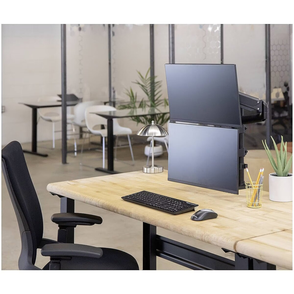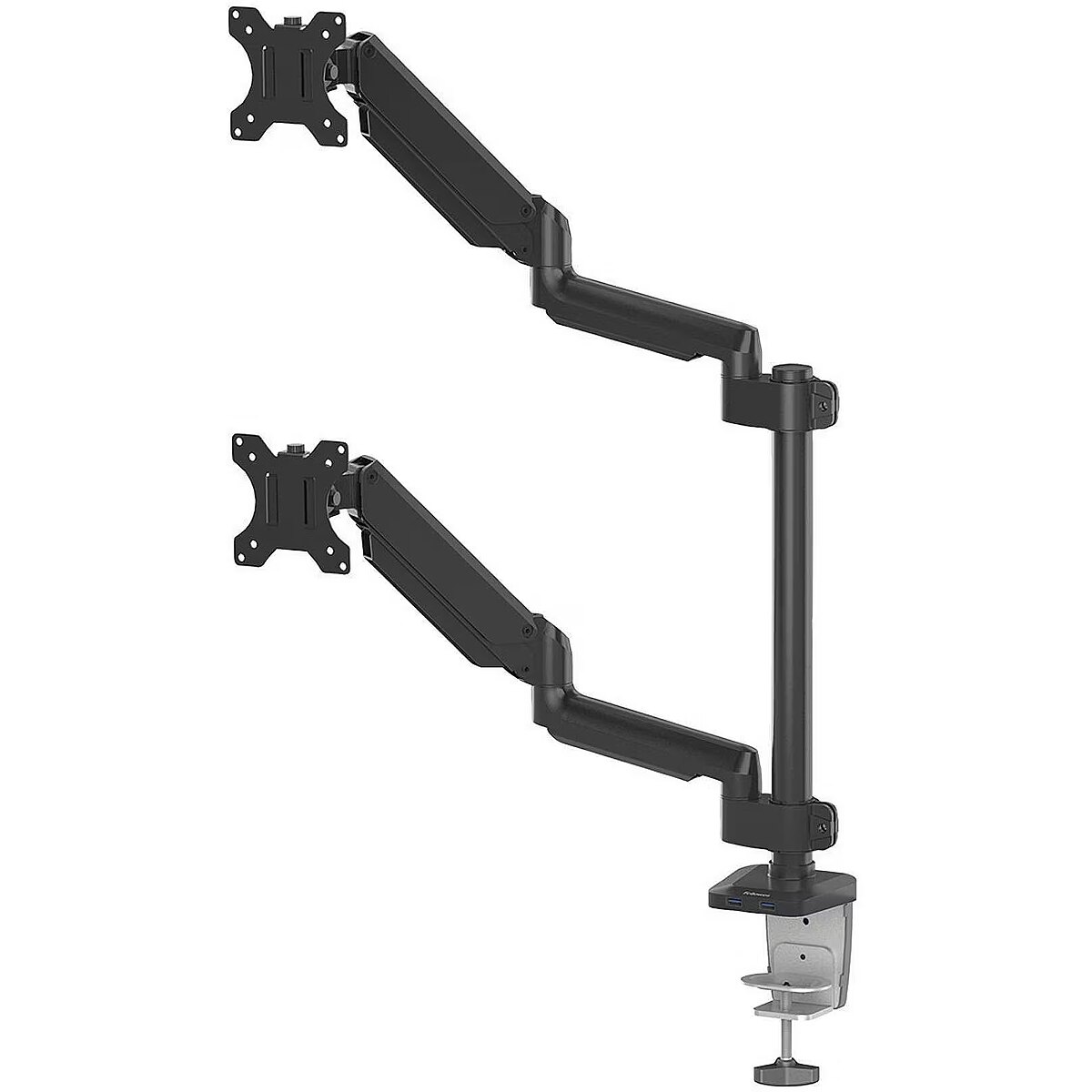Description - Platinum Series Dual Stacking Monitor Arm - Black - Increase valuable desk space and easily adjust your monitors to reduce eye, neck and shoulder strain - Fully independent adjustable dual monitor arm with innovative gas spring technology providing effortless monitor adjustment for collaborative working and screen sharing - Dual monitors are in stacked position to save space in tight workspaces. - Holds up to a 27" monitors up to 20kgs in total (10kgs per arm) - Built in dual USB 3.0 ports make it easy to stay connected your favourite devices - Intuitive cord management system helps minimize clutter - Easy to mount – can be mounted via clamp or grommet - Specifications: +85° / -15° Tilt, 180° Pan, 360° Rotation