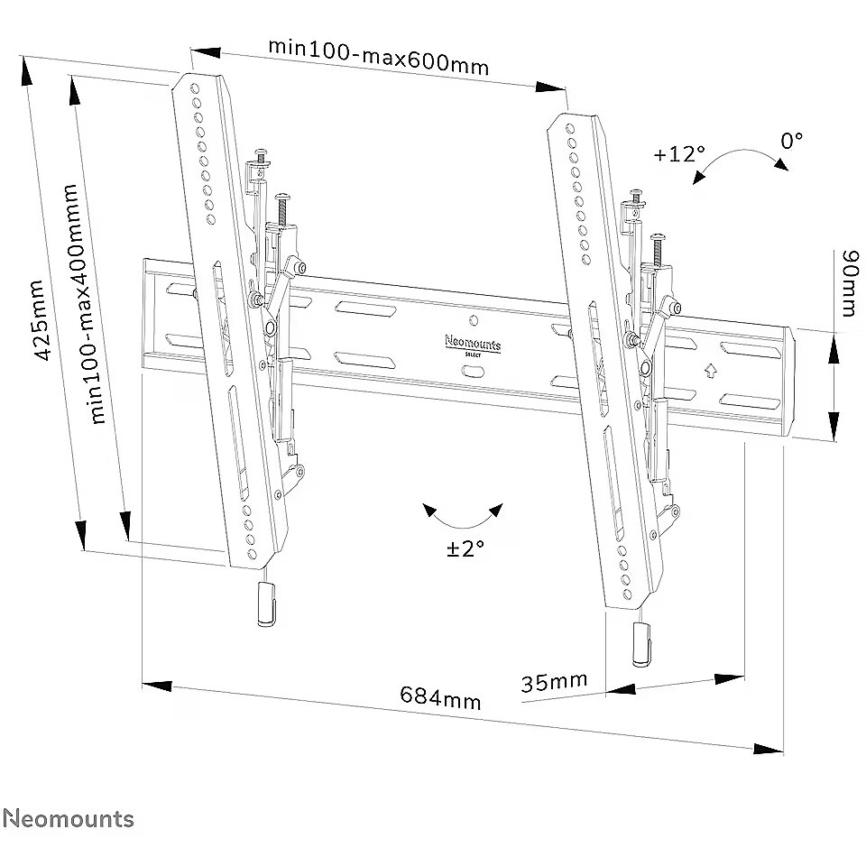 LongSummaryDescription - Neomounts WL35S-850BL16 TV mount wall 42-86" - tiltable - lockable - fast installation. Maximum weight capacity: 60 kg, Minimum screen size: 106.7 cm (42"), Maximum screen size: 2.18 m (86"), Minimum VESA mount: 100 x 100 mm, Maximum VESA mount: 600 x 400 mm. Height adjustment range: 0 - 20 mm, Tilt angle range: 0 - 12°, Distance to the wall (max): 3.5 cm. Product colour: Black