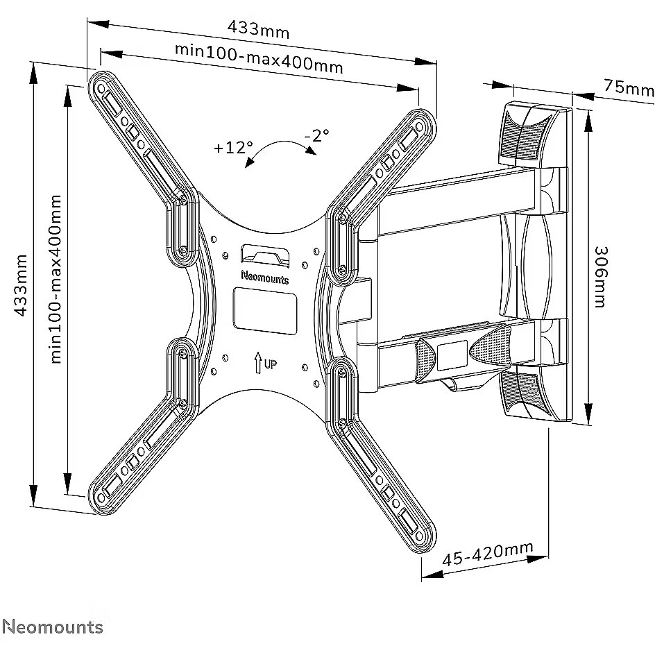 ShortSummaryDescription - Neomounts WL40-550BL14 TV mount wall 32-55" - full motion - easy install, 100 x 100 mm, 400 x 400 mm, -2 - 12°, 0 - 40°, Steel, Black