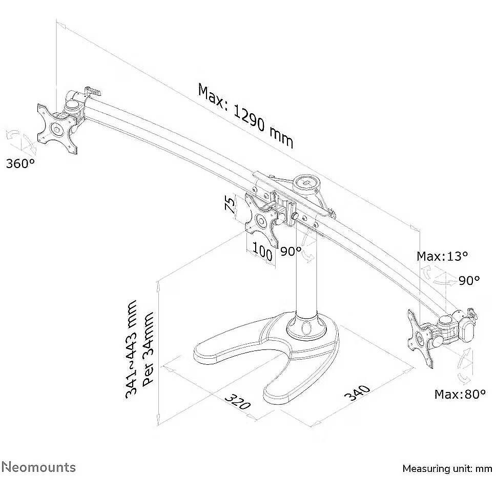 Description - The NewStar desk mount, model FPMA-D700DD3 is a tilt- and rotatable desk mount for 3 flat screens up to 27”. This mount is a great choice for space saving placement on desks using a desk stand or grommet mount. NewStars’ unique rotate (360°) and swivel (45°) technology allows the mount to change to any viewing angle to fully benefit from the capabilities of the flat screen. The mount is manually height adjustable from 32 to 42 centimetres. Depth 7 centimetres. A unique cable management conceals and routes cables from mount to flat screen. Hide your cables to keep the workplace nice and tidy. NewStar FPMA-D700DD3 has one pivot point and is suitable for screens up to 27" (68 cm). The weight capacity of this product is 8 kg each screen. The desk mount is suitable for screens that meet VESA hole pattern 75x75 or 100x100mm. Different hole patterns can be covered using NewStar VESA adapter plates. By using an ergonomic mount neck- and back complaints can be avoided. Ideal for use in offices and on counters or in a reception area. All installation material is included with the product. Screens:3 Screen size: 19-27" Max. weight: 24 kg Desk mount: Desk stand & grommet VESA minimum: 75x75 mm VESA maximum: 100x100 mm Depth: 0-7 cm Width: 32-130 cm Height: 34 - 45 cm Rotation: 360° Swivel: 45°