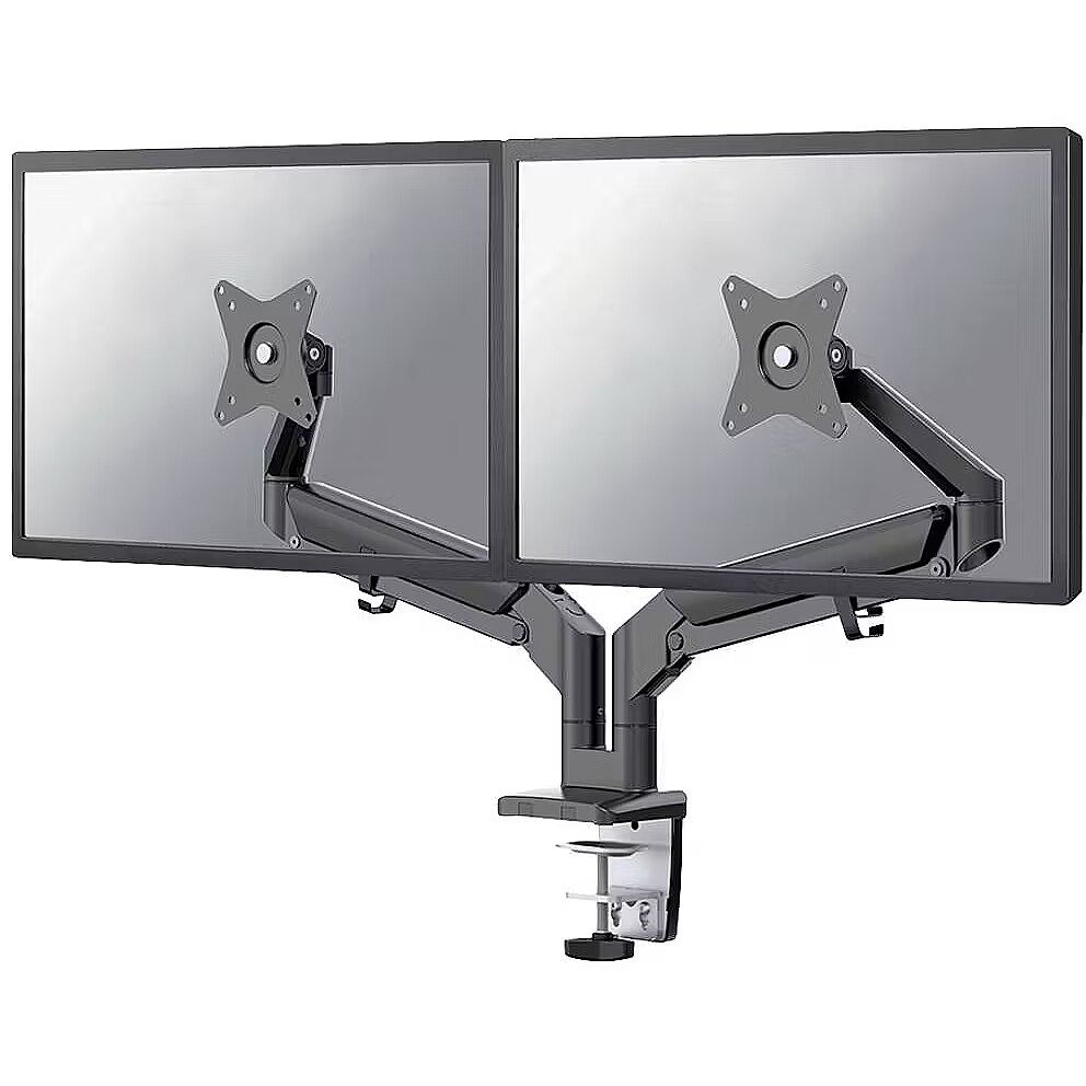 LongDesc - The Neomounts DS70-810BL2 is a full motion desk mount for two flat screens up to 32" with a maximum weight capacity of 9 kg per screen. The versatile tilt (90°), rotate (360°) and swivel (180°) technology allows the mount to change to any viewing angle to fully benefit from the capabilities of your screens. Additionally, the mount features gas spring height adjustment (26,5-55 cm) and depth adjustment (0-49 cm), to create the perfect working position. Additionally, the DS70-810BL2 features the nifty 180° stop mechanism, that allows you to safely adjust the mount even when it's placed close to a wall or separation panel without making contact. The smart cable management clips ensure orderly routing of the cables.Due to the short T-Rex® upper arm, only minimal depth is required when placed near a wall or separation panel.This allows the screens to be positioned further away from the user which is better for the eyes and also leaves more space for good ergonomic working posture. The DS70-810BL2 is suitable for screens that meet VESA hole pattern 75x75 or 100x100mm. Unused hole patterns can be covered using one of Neomounts VESA adapter plates. The DS70-810BL2 is equipped with an Quick-release VESA system for easy installation and comes with both desk clamp and grommet.
