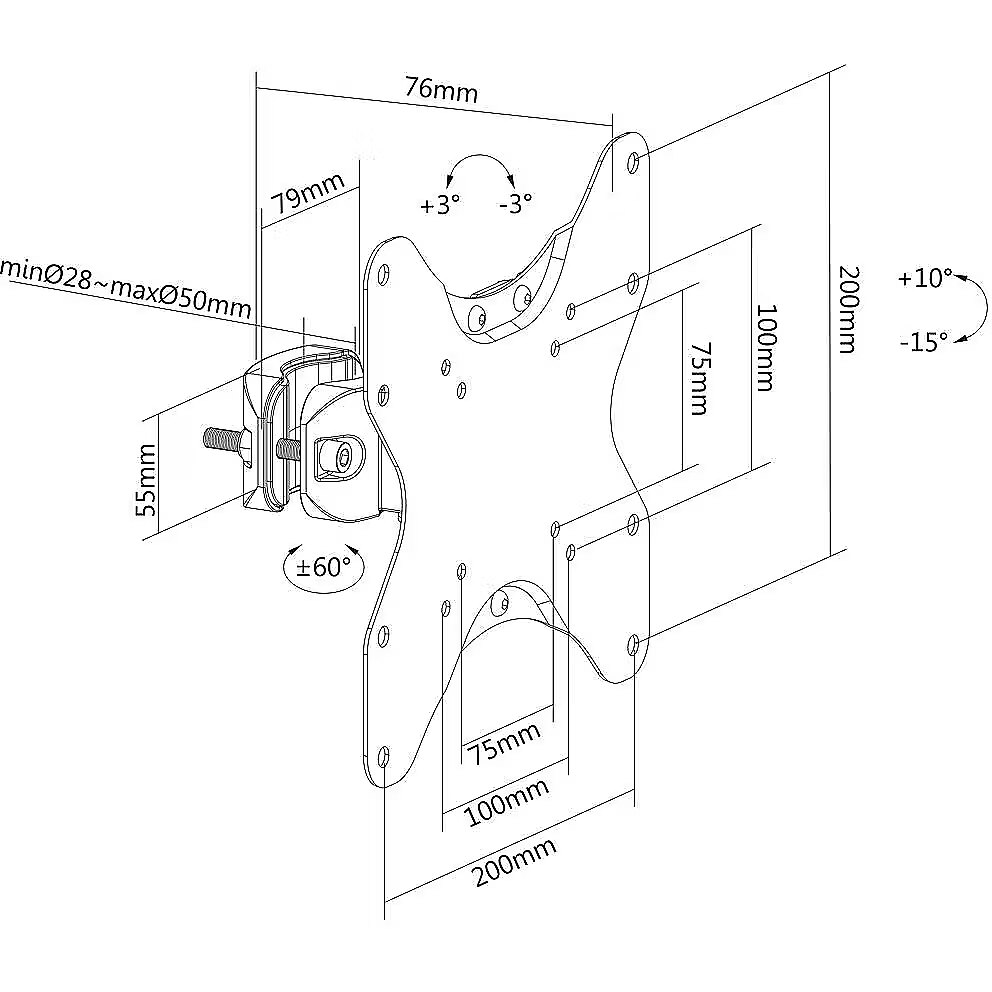 LongSummaryDescription - Neomounts FL40-430BL12 TV pole mount 23-42" - diam. 28-50 mm. Maximum weight capacity: 25 kg, Minimum screen size: 58.4 cm (23"), Maximum screen size: 106.7 cm (42"), Minimum VESA mount: 75 x 75 mm, Maximum VESA mount: 200 x 200 mm. Tilt angle range: -15 - 10°, Swivel angle range: 0 - 120°, Distance to the wall (max): 7.6 cm. Product colour: Black