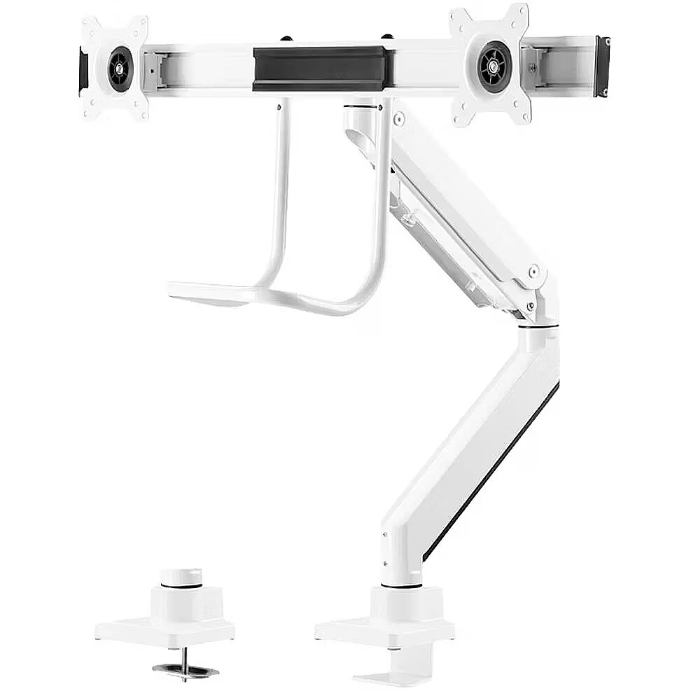 LongDesc - The Neomounts NM-D775DXWHITE is a tilt-, swivel and rotatable desk mount with crossbar and handle for 2 flat screens up to 32". This mount is a great choice for space saving placement on desks using a desk clamp or grommet mount.Neomounts' unique tilt (20°), rotate (360°) and swivel (180°/360°) technology allows the mount to change to any viewing angle to fully benefit from the capabilities of the flat screen. The mount is easily individually height adjustable to 60 centimetres using a gas spring. Depth adjustable from 0 to 63 centimetres. A unique cable management conceals and routes cables from mount to flat screen. Hide your cables to keep the workplace nice and tidy. The mount is equipped with a 180° stop mechanism.Neomounts NM-D775DXWHITE with handle has three pivot points and is suitable for screens up to 32" (81 cm). The weight capacity of this product is 1 to 16 kg (max. 8 kg each screen). The desk mount is suitable for screens that meet VESA hole pattern 75x75 or 100x100mm. Different hole patterns can be covered using Neomounts VESA adapter plates.By using an ergonomic mount neck- and back complaints can be avoided. Ideal for use in offices and on counters or in a reception area.All installation material is included with the product.