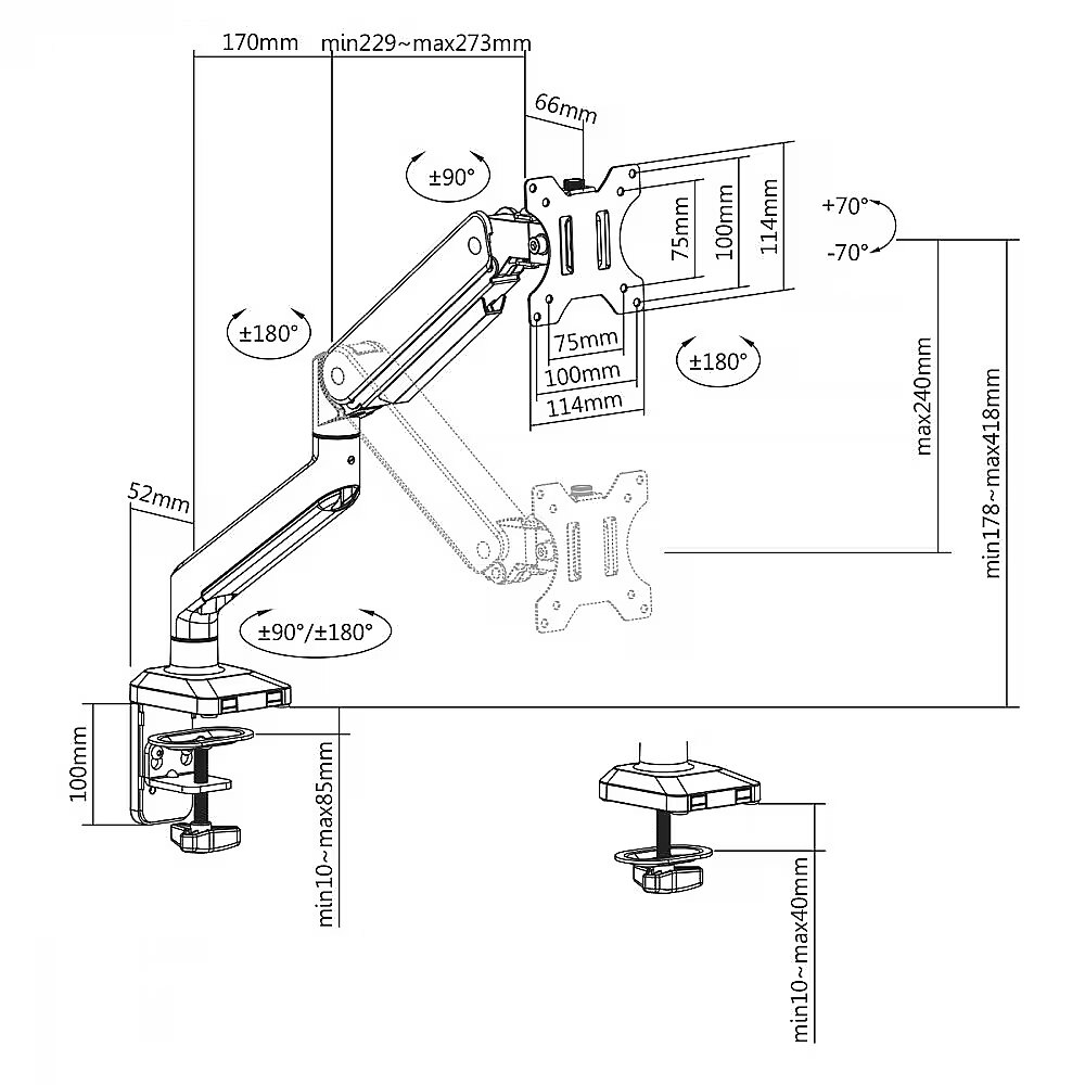 Other features - Tilt adjustment from -70 to +70 degrees Gas spring - Cable masking system High quality workmanship Very easy assembly The mount can be attached to a tabletop or to a cable hole Suitable for monitors 17" to 32" (or bigger, if their weight does not exceed 10 kg and the VESA standard is compatible with the mount) VESA 75x75, 100x100 mm