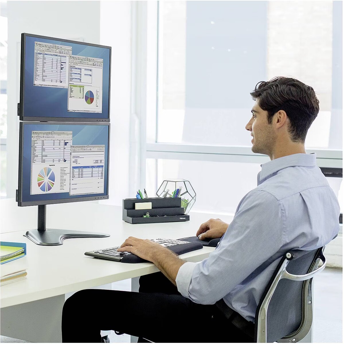 LongDesc - Sitting or standing with bad posture all day using a computer is bad for your health. Leaning forwards or tilting your head up or down not only causes back and neck strain but is also bad for your eyes. The Fellowes Seasa dual monitor stand will improve your ergonomic posture and reduce back neck and eye strain. Dual screen working means you can view more screen content and can use multiple programs simultaneously, whilst saving space and keeping your office tidy with the stacked monitor design. With ever shrinking office spaces, using a dual monitor stand means you can free up valuable work space to become more organised and productive. With effortless adjustment you can collaborate and share information with colleagues easily, making them perfect for hot desks or shared desks. The Fellowes double monitor stand is ideal for any workspace, with its stylish, convenient design. This fully independent adjustable dual monitor arm by Fellowes can pan 120°, tilt +/-45° and can rotate 360° for optimum viewing control. Intuitive cable management system and low profile base helps you minimise clutter with the Fellowes Seasa dual monitor mount. It's free standing ability enables dual monitor arms to be used in spaces that do not allow a clamp or grommet mount - each arm can hold 8KG monitors with a maximum screen size of 32"/81.28cm and meets VESA monitor bracket standards.