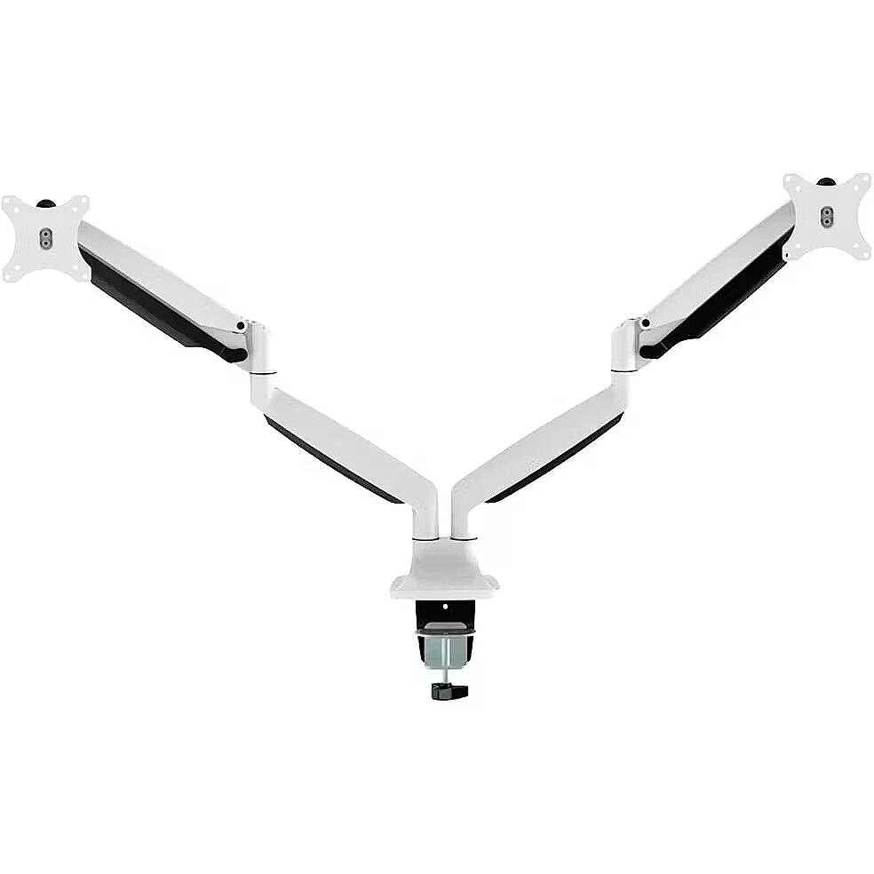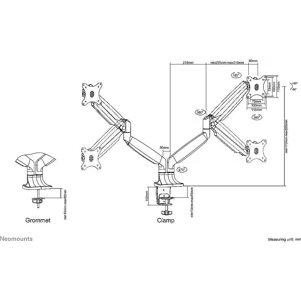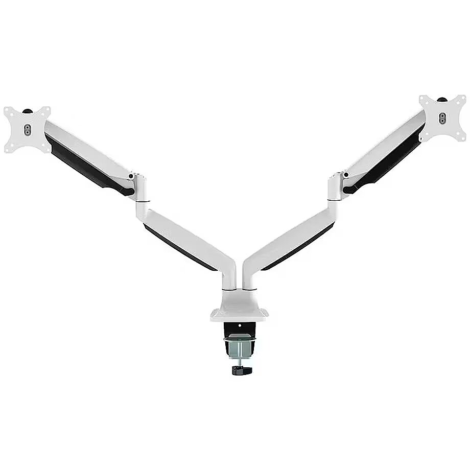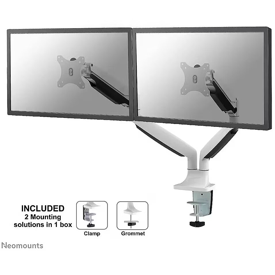LongDesc - The Neomounts desk mount, model NM-D750DWHITE is a tilt-, swivel and rotatable desk mount for 2 flat screens up to 32". This mount is a great choice for space saving placement on desks using a desk clamp or grommet mount.Neomounts' unique tilt (180°), rotate (180°) and swivel (180°) technology allows the mount to change to any viewing angle to fully benefit from the capabilities of the flat screen. The mount is easily individually height adjustable from 17 to 51 centimetres using a gas spring. Depth adjustable from 0 to 61 centimetres. A unique cable management conceals and routes cables from mount to flat screen. Hide your cables to keep the workplace nice and tidy.Neomounts NM-D750DWHITE has three pivot points and is suitable for screens up to 32" (82 cm). The weight capacity of this product is 9 kg each screen. The desk mount is suitable for screens that meet VESA hole pattern 75x75 or 100x100mm. Different hole patterns can be covered using Neomounts VESA adapter plates.By using an ergonomic mount neck- and back complaints can be avoided. Ideal for use in offices and on counters or in a reception area.All installation material is included with the product.