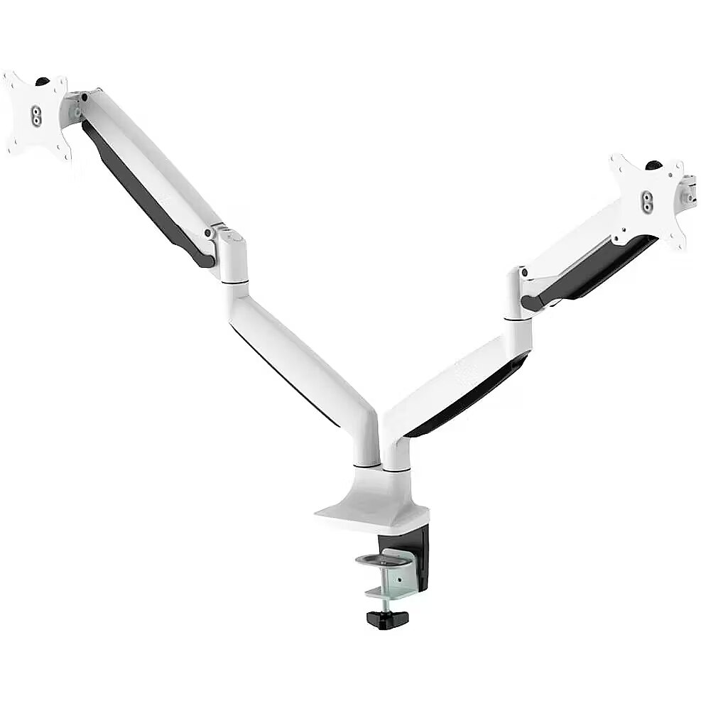 Description - The Neomounts Select desk mount, model NM-D750DWHITE is a tilt-, swivel and rotatable desk mount for 2 flat screens up to 32?. This mount is a great choice for space saving placement on desks using a desk clamp or grommet mount. Neomounts Selects? unique tilt (180°), rotate (180°) and swivel (180°) technology allows the mount to change to any viewing angle to fully benefit from the capabilities of the flat screen. The mount is easily individually height adjustable from 17 to 51 centimetres using a gas spring. Depth adjustable from 0 to 61 centimetres. A unique cable management conceals and routes cables from mount to flat screen. Hide your cables to keep the workplace nice and tidy. Neomounts Select NM-D750DWHITE has three pivot points and is suitable for screens up to 32" (82 cm). The weight capacity of this product is 9 kg each screen. The desk mount is suitable for screens that meet VESA hole pattern 75x75 or 100x100mm. Different hole patterns can be covered using Neomounts Select VESA adapter plates. By using an ergonomic mount neck- and back complaints can be avoided. Ideal for use in offices and on counters or in a reception area. All installation material is included with the product. Screen size: 10 - 32" Desk mount: Desk clamp & grommet Depth: 0-61 cm Height: 17-51 cm Tilt: 180° Rotation: 180° Swivel: 180°