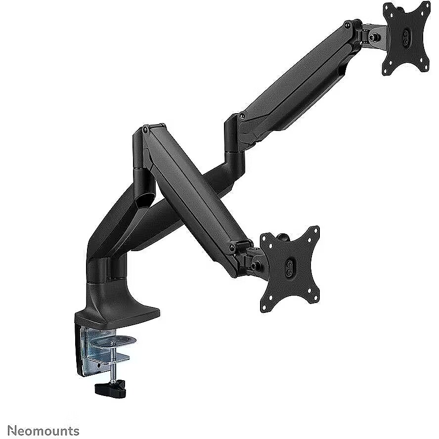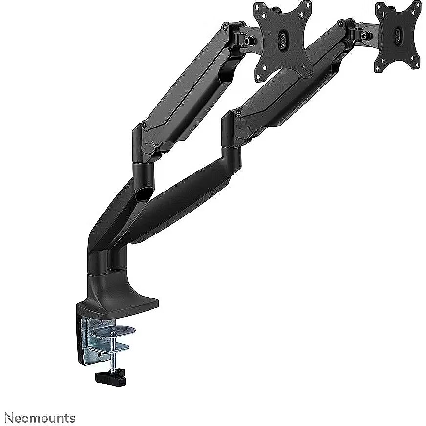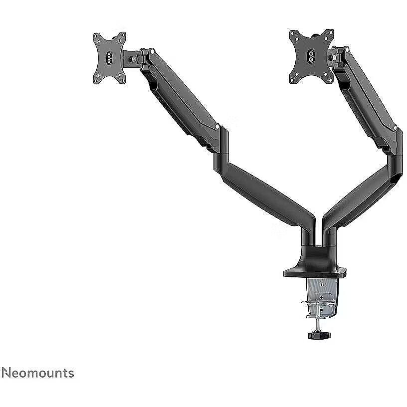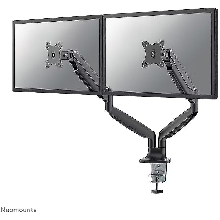 LongDesc - The Neomounts desk mount, model NM-D750DBLACK is a tilt-, swivel and rotatable desk mount for 2 flat screens up to 32". This mount is a great choice for space saving placement on desks using a desk clamp or grommet mount.Neomounts' unique tilt (180°), rotate (180°) and swivel (180°) technology allows the mount to change to any viewing angle to fully benefit from the capabilities of the flat screen. The mount is easily individually height adjustable from 17 to 51 centimetres using a gas spring. Depth adjustable from 0 to 61 centimetres. A unique cable management conceals and routes cables from mount to flat screen. Hide your cables to keep the workplace nice and tidy.Neomounts NM-D750DBLACK has three pivot points and is suitable for screens up to 32" (82 cm). The weight capacity of this product is 9 kg each screen. The desk mount is suitable for screens that meet VESA hole pattern 75x75 or 100x100mm. Different hole patterns can be covered using Neomounts VESA adapter plates.By using an ergonomic mount neck- and back complaints can be avoided. Ideal for use in offices and on counters or in a reception area.All installation material is included with the product.
