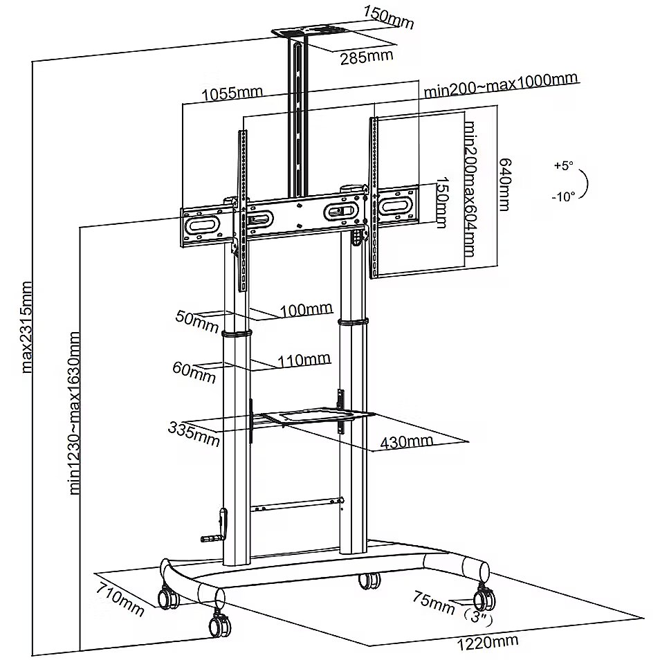 Dimensions - Base dimensions: 1220 x 710 mm AV shelf dimensions: 430 x 335 mm Camera shelf dimensions: 185 x 150 mm Maximum overall height: 2320 mm