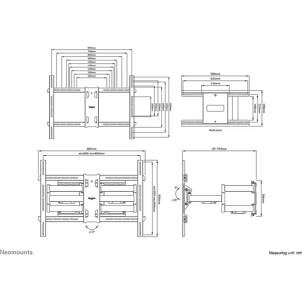 Description - The Neomounts Select WL40S-950BL18 is a heavy-duty full motion wall mount for flat screens up to 110" with a maximum load of 125kg. Versatile tilt (20°) and swivel (90°) technology to create the optimal viewing angle Level adjustment available for perfect installation The WL40S-950BL18 has a depth of 8.2 to 70 cm and is suitable for VESA screens from 300x200 to 800x600 mm. For extra-large VESA patterns (800x600 to 1200x900), the optional VESA adapter kit AWLS-950BL1 is available. The mount features a clever Easy-release system that allows you to attach your TV in no time. For easy installation, the wall mount comes pre-assembled and a separate spirit level and mounting template are included with the wall mount. The mount features high-quality steel cable guides to secure loose cables to the back of the screen.
