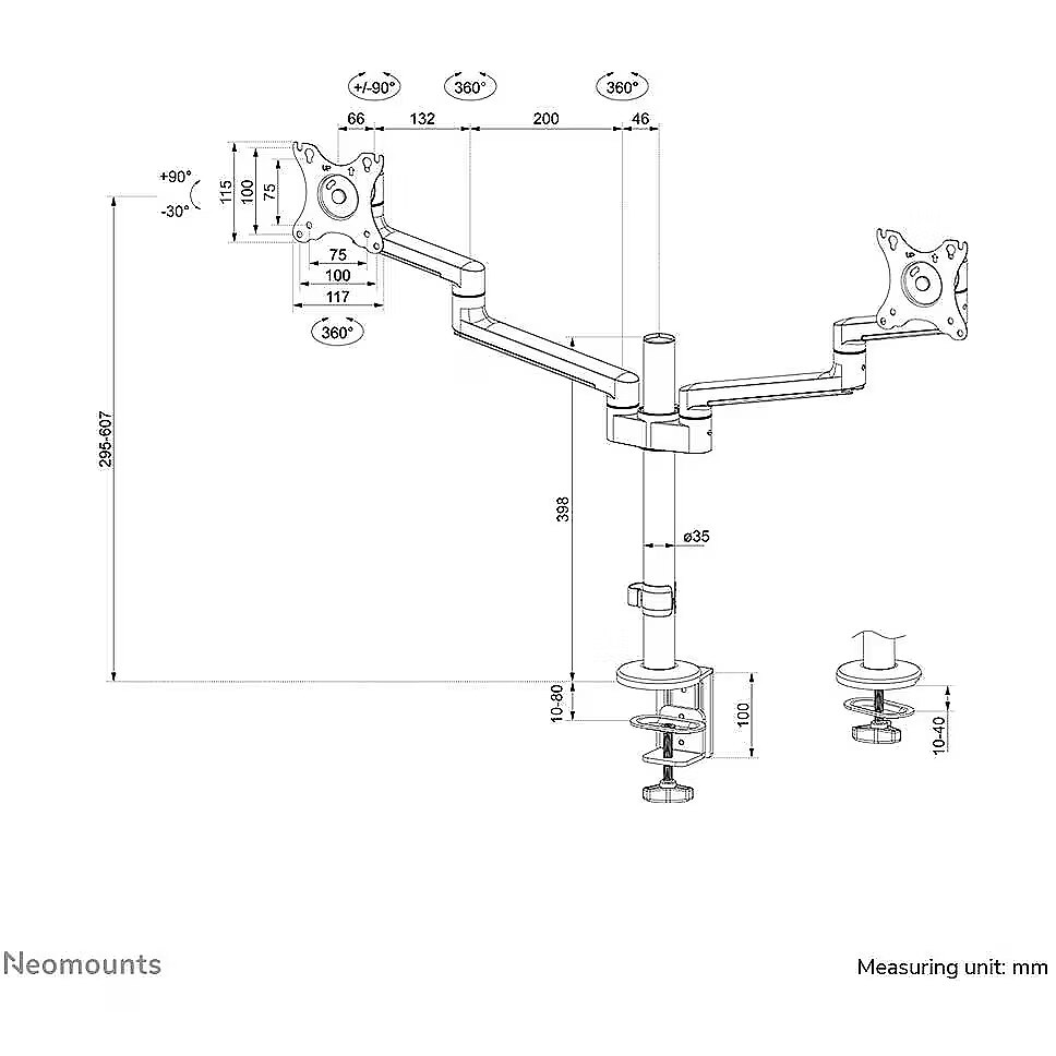 LongSummaryDescription - Neomounts DS60-425BL2 Monitor arm 17-27" - space saving. Mounting: Clamp/Grommet, Minimum screen size: 43.2 cm (17"), Maximum screen size: 68.6 cm (27"), Minimum VESA mount: 75 x 75 mm, Maximum VESA mount: 100 x 100 mm. Height adjustment, Swivel angle range: -90 - 90°, Tilt angle range: -30 - 90°. Product colour: Black