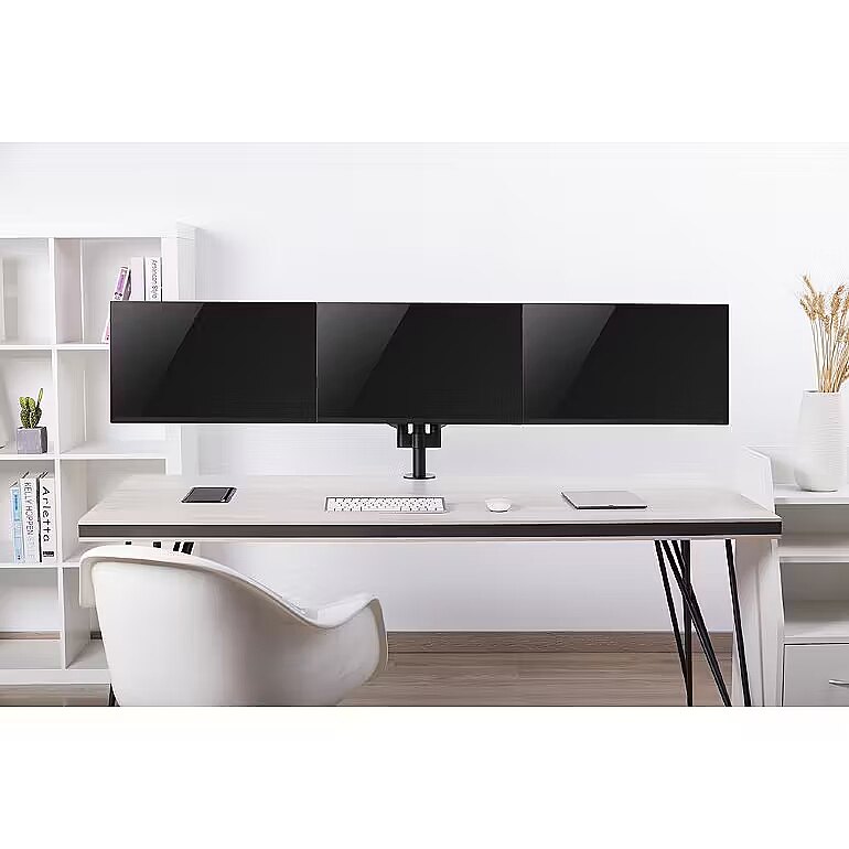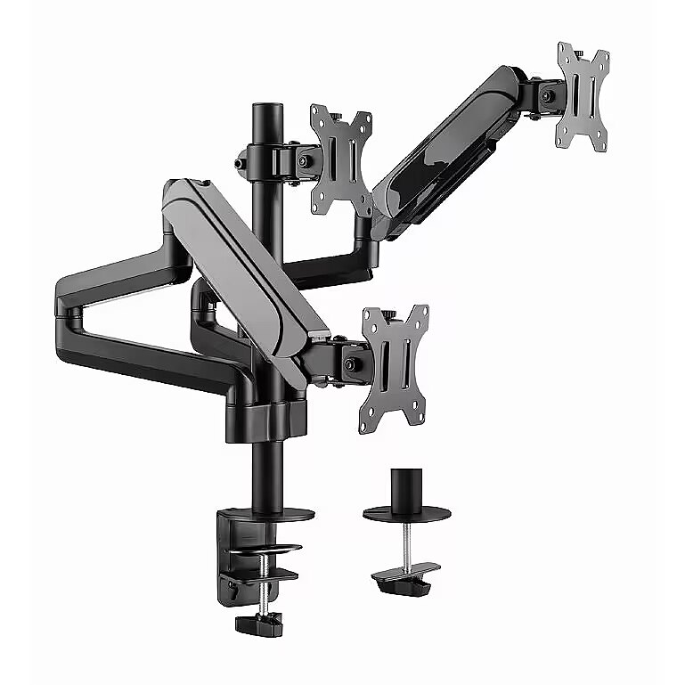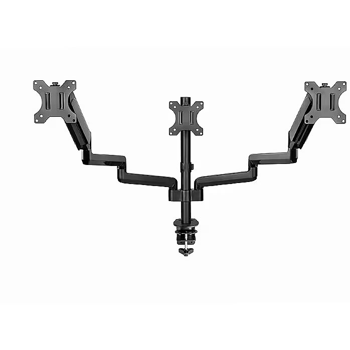 Description - Desk mounted adjustable mounting arm for 3 monitors (full-motion) Position your screen perfectly Lightweight and tilting design Adjustable monitor desk mount for 3 monitors Two arms rotate, extend and retract, tilt to change reading angles, and allow to rotate displays from landscape-to-portrait mode, etc Central mount allows height adjustment, swivel, tilt and rotation Enables easy ergonomic positioning for reduced strain Works with almost any LCD monitor (max. 27" ) Durable adjustable gas-springs suitable for monitors of 1 - 7 kg Strong desk clamp or grommet for easy and secure fixation on your desk Built-in cable management for an organized and neat workspace VESA compatible (100 x 100 mm and 75 x 75 mm)