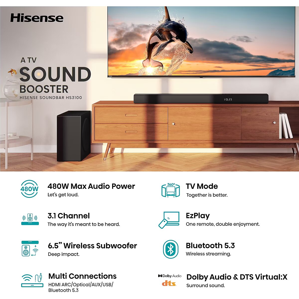 LongSummaryDescription - Hisense HS3100. Audio output channels: 3.1 channels, RMS rated power: 480 W, Audio decoders: DTS Virtual:X, Dolby Digital. Soundbar speaker RMS power: 180 W. Subwoofer type: Active subwoofer, Subwoofer connectivity: Wireless, Subwoofer RMS power: 180 W. Product colour: Black. Connectivity technology: Wired & Wireless