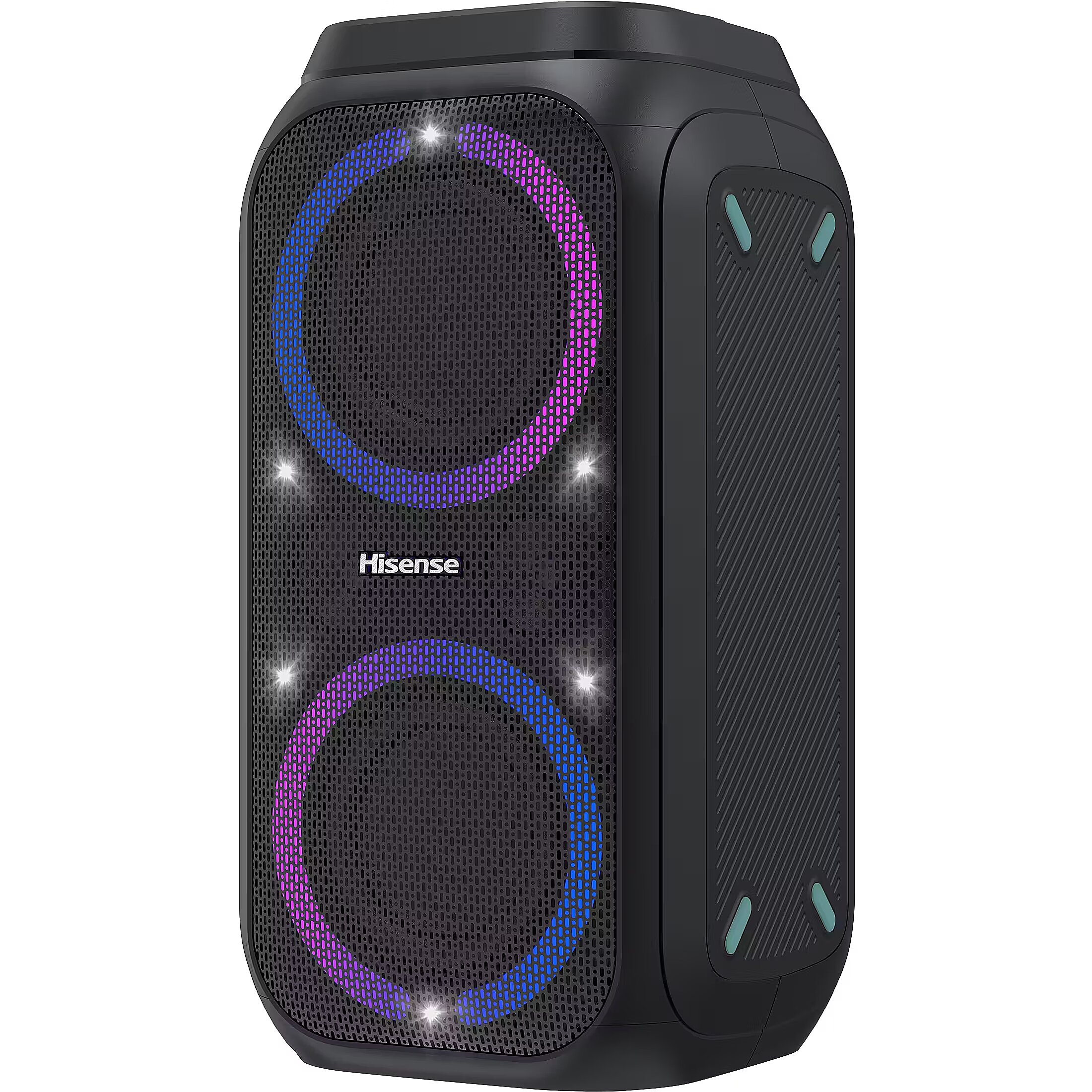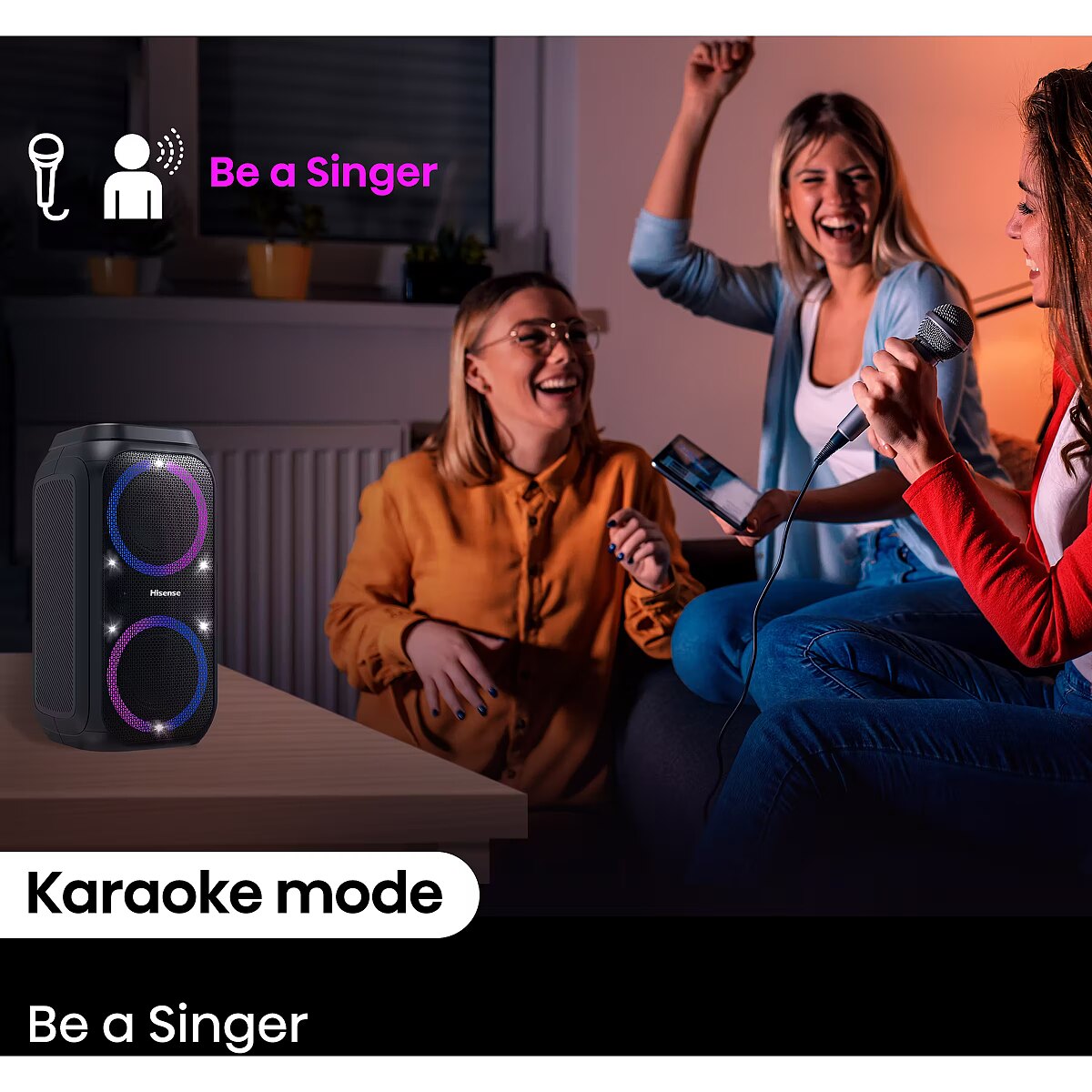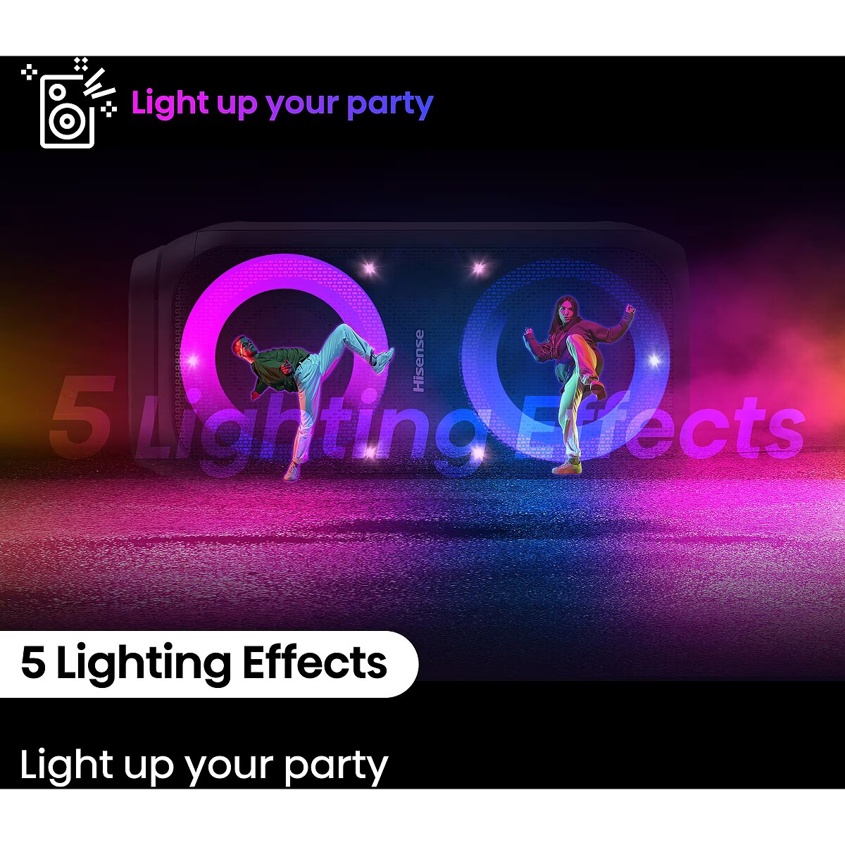 LongDesc - 160W Max Audio PowerCompact, yet PowerfulExperience rich, thunderous bass with 2 built-in subwoofers designed for deep audio. Enjoy crystal-clear highs as 2 built-in tweeters deliver sharp, high-pitched tones, creating an unforgettable party atmosphere.12 Hours Long PlaytimeRock day and nightUp to 12 hours of battery capacity of 5100mAH, never stop rocking.Pair PlayLet's Party TogetherParty with your friends when double Hisense Party Speakers are wireless connected. Perfect for any gathering, Pair Play turns up the fun.5 Lighting EffectsLight up your partyBoost your party with an epic light show. Let the colors groove the music for a next-level audio-visual party.Karaoke ModeBe a SingerKaraoke Mode supported with Vocal Fader gives you the spotlight. Solo or Duet, all up to you.Easy ConnectivityConnect and PlayEasy wireless connection to enjoy music from your smartphone and other devices.