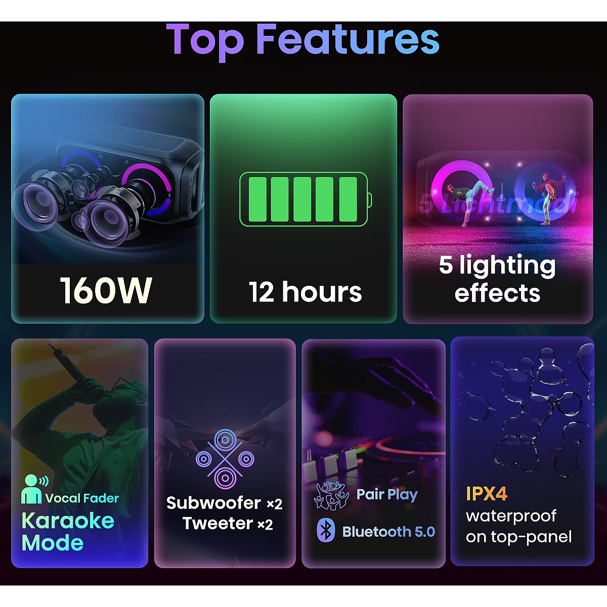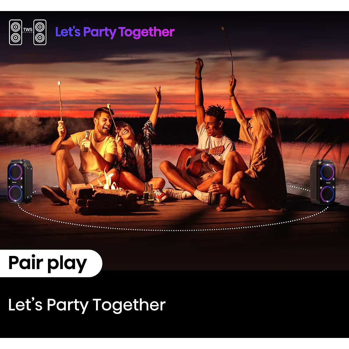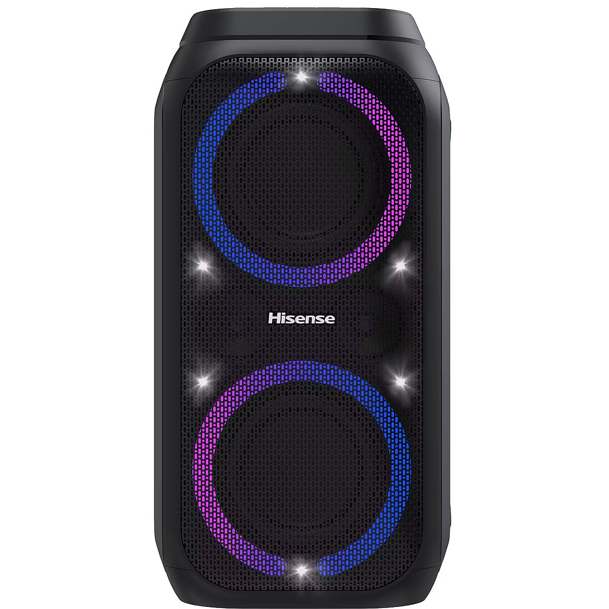 LongDesc - 160W Max Audio PowerCompact, yet PowerfulExperience rich, thunderous bass with 2 built-in subwoofers designed for deep audio. Enjoy crystal-clear highs as 2 built-in tweeters deliver sharp, high-pitched tones, creating an unforgettable party atmosphere.12 Hours Long PlaytimeRock day and nightUp to 12 hours of battery capacity of 5100mAH, never stop rocking.Pair PlayLet's Party TogetherParty with your friends when double Hisense Party Speakers are wireless connected. Perfect for any gathering, Pair Play turns up the fun.5 Lighting EffectsLight up your partyBoost your party with an epic light show. Let the colors groove the music for a next-level audio-visual party.Karaoke ModeBe a SingerKaraoke Mode supported with Vocal Fader gives you the spotlight. Solo or Duet, all up to you.Easy ConnectivityConnect and PlayEasy wireless connection to enjoy music from your smartphone and other devices.