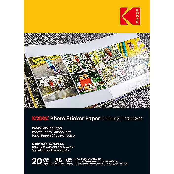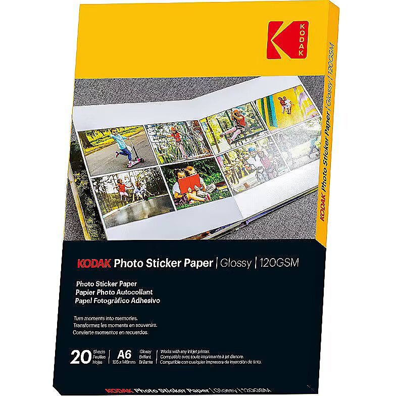 description_en - The 20-sheet pack of KODAK adhesive photo paper allows you to print a large number of photos, perfect for creative projects, photo albums, and personalized gifts. With a 10 x 15 cm (A6) format, these adhesive photo paper sheets offer enough space to print large photos or several photos on a single sheet. This self-adhesive photo paper is easy to use and handle, simply print your photos on the paper, cut them to fit your needs, and stick them on any flat and smooth surface. KODAK photo paper provides a glossy finish for vibrant photos with high-quality resolution. Ideal for printing family photos, artwork, and memorable moments. The KODAK photo sticker paper is compatible with inkjet printers, allowing you to print high-quality photos directly from your own printer.