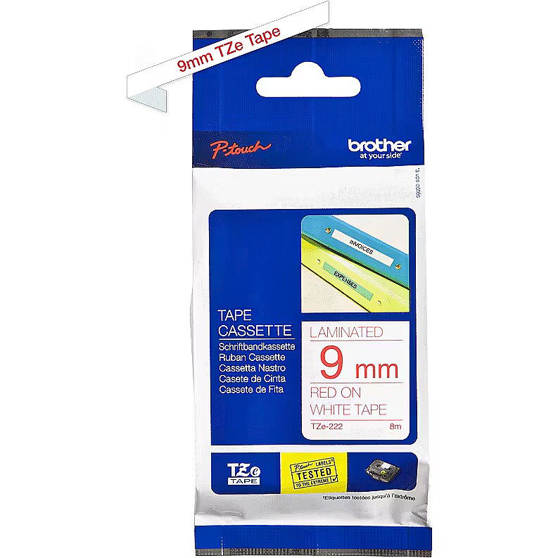LongSummaryDescription - Brother Laminated tape 9mm. Label colour: Red on white, Tape type: TZe, Print technology: Thermal transfer. Tape width: 9 mm, Tape length: 8 m, Width: 18 mm. Pallet gross height: 16.2 cm, Master (outer) cases per pallet: 36 pc(s), Layers per pallet: 6 pc(s). Tape size: 9 mm