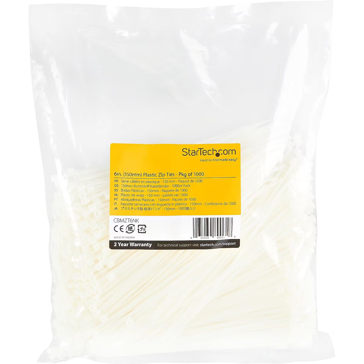 LongDesc - 1000 Pack | Medium | 6" 152.4 mm | White | Nylon 66 |94V-2 Fire & UL Rated | TAA | ULThese Medium cable ties enable you to conveniently bundle and secure multiple cables, to route and organize them. 1000 White cable ties are included, ensuring you'll have plenty on hand.Keep Cables OrganizedThese plastic electrical cable wraps are 6" (15 cm) in length securing cable bundles up to 1.53" (39 mm) in diameter. They're quick and easy to install or remove, with adjustable tension and a basic one-piece design -- perfect for organizing network cables, power cables, or other cables at your home or office workstation.Industrial StrengthMade of durable Nylon 66 material, these cable ties are tough and flexible. They've been rigorously tested to support up to 40 lbs (18.1 kg) of weight & are UL94 V-2 fire rated, UL Approved, and CE & Lloyd's Register Certified.Available in Different Lengths and ColorsTo suit any application, StarTech.com offers a wide selection of these cable ties in different lengths and colors:100-pack - 4" (10 cm) Black Cable Ties (CBMZT4B)100-pack - 4" (10 cm) White Cable Ties (CBMZT4N)1000-pack - 4" (10 cm) Black Cable Ties (CBMZT4BK)1000-pack - 4" (10 cm) White Cable Ties (CBMZT4NK)100-pack - 6" (15 cm) Black Cable Ties (CBMZT6B)100-pack - 6" (15 cm) White Cable Ties (CBMZT6N)1000-pack - 6" (15 cm) Black Cable Ties (CBMZT6BK)1000-pack - 6" (15 cm) White Cable Ties (CBMZT6NK)100-pack - 8" (20 cm) Black Cable Ties (CBMZT8B)100-pack - 8" (20 cm) White Cable Ties (CBMZT8N)1000-pack - 8" (20 cm) Black Cable Ties (CBMZT8BK)1000-pack - 8" (20 cm) White Cable Ties (CBMZT8NK)100-pack - 10" (25 cm) Black Cable Ties (CBMZT10B)100-pack - 10" (25 cm) White Cable Ties (CBMZT10N)1000-pack - 10" (25 cm) Black Cable Ties (CBMZT10BK)1000-pack - 10" (25 cm) White Cable Ties (CBMZT10NK)These cable wraps are backed by a StarTech.com Lifetime warranty and free 24/5 technical support. StarTech.com has been the IT professionals choice for over 30 years.The StarTech.com Advantage