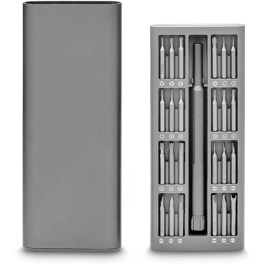 Technical_details - Type: bit set Colour: aluminium EAN: 3831109851012 Made in China Intended use: PC, water cooling and other electronics repairs Number of parts: 49 parts Tools included: bits, socket wrenches Profiles included: Inside TORX T, Phillips (PH), Slotted, Tamper Resistant TORX (TH), TRI-WING Operating tool: plug-in handle, magnetic : hexagon Bits: 49 pieces: suitable for manual operation : 5 pieces: PH 000 / PH 00 / PH 0 / PH 1 / PH 2 : 7 pieces: SL 1 / SL 1.5 / SL 2 / SL 2.5 / SL 3 / SL 3.5 / SL 4 : 3 pieces: T 2 / T 3 / T 4 8 pieces: D 5 H / D 6 H / D 7 H / D 8 H / D 9 H / D 10 H / D 15 H / D 20 H : 9 pieces: 0.7mm / 0.9mm / 1.3mm / 1.5mm / 2mm / 2.5mm / 3mm / 4mm : 3 pieces More Content: SIM Eject Bit 0.8 / Pentagon P2, P5, P6 / U-Type U2,6 U3 / Mainboard size 2.5 / Square SQ0, SQ1, SQ2 / Triangle 2.0, 2.3, 3.0 Container: metal cassette Area of application: workshop, electronic devices Feature: Durable matte aluminum body, 2 push and pop-out plastic shells Additional information: Bit material: S2 steel, HRC 58-62 Dimensions: Width: 66mm x Height: 15mm x Depth: 186mm Weight: 275 grams