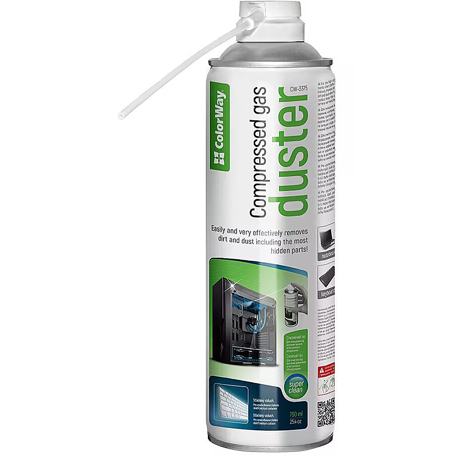 Technical details > Other features - Compressed gas duster TM ColorWay for cleaning keyboards, printers, computers, laptops, phones and other office and household appliances by blowing dust in tight spaces and small items. Cleaning is carried out with a short press on button directed air stream, with a maximum can`s tilt without exceeding more than 30 degrees