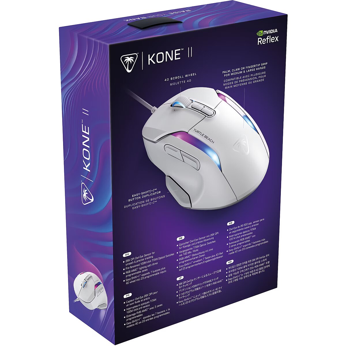 ShortSummaryDescription - Turtle Beach Kone II Arctic White – Wired Ergonomic RGB Gaming Mouse, 26K DPI Optical Sensor, 100M Click Life Optical Switches, 23 Customizable Inputs, 4D Scroll Wheel, Pure PTFE glides, Right-hand, Optical, USB Type-A, 26000 DPI, White