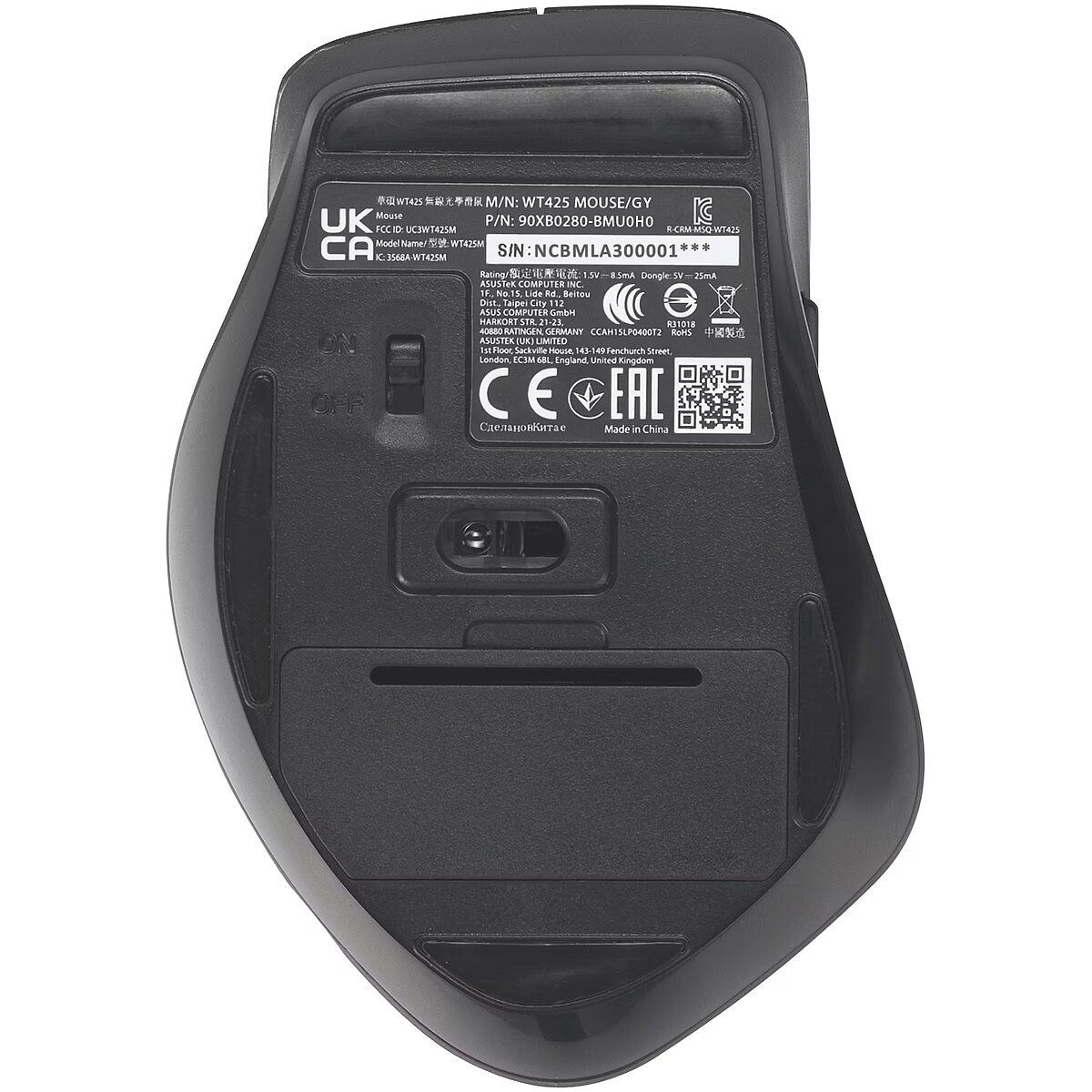 LongSummaryDescription - ASUS WT425. Form factor: Right-hand. Movement detection technology: Optical, Device interface: RF Wireless, Movement resolution: 1600 DPI, Buttons type: Pressed buttons, Buttons quantity: 6, Scroll type: Wheel. Power source: Batteries. Product colour: Black, Grey