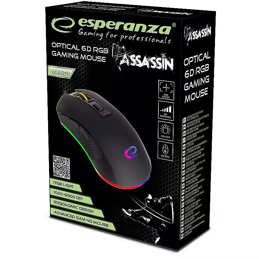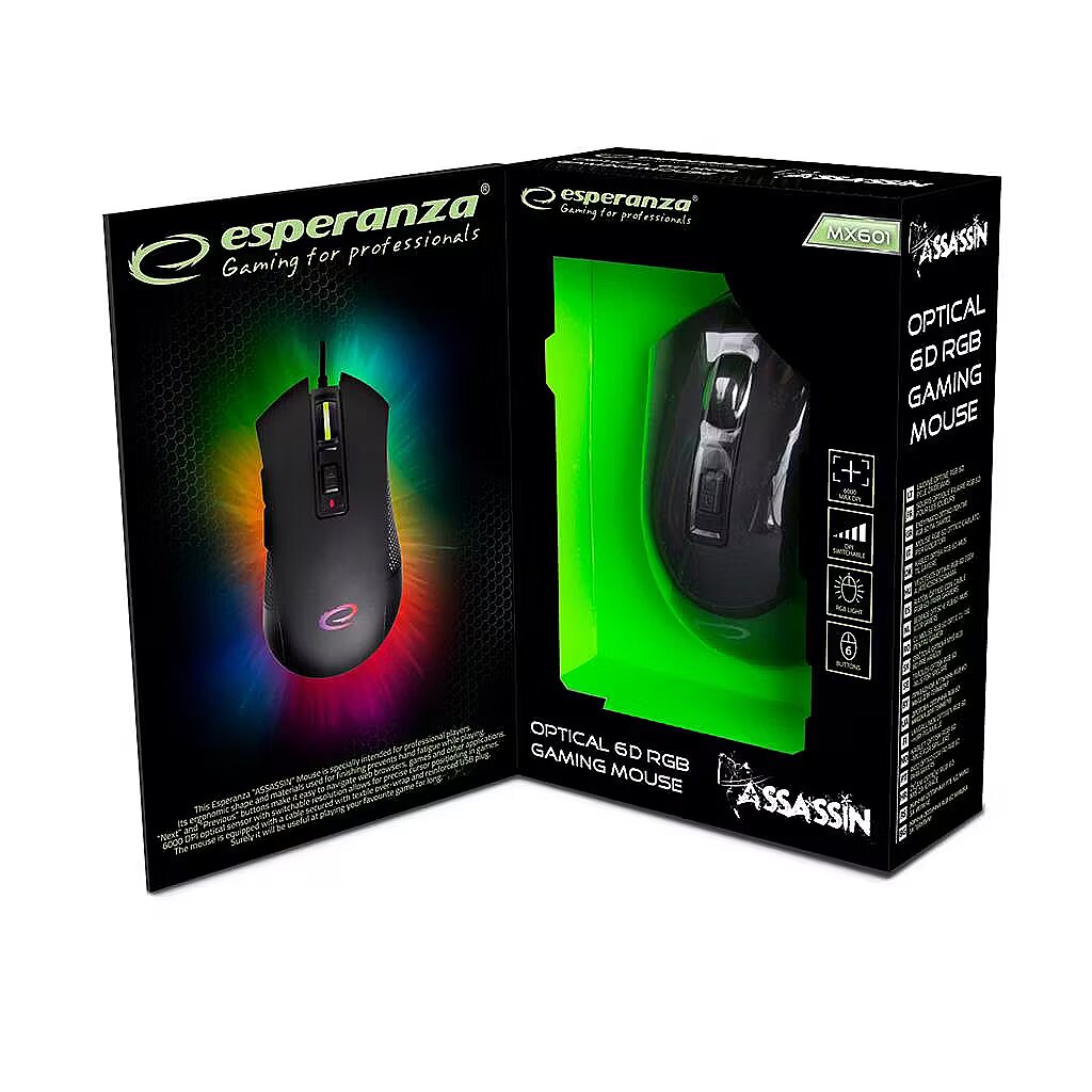 Description - This Esperanza "ASSASSIN" Mouse is specially intended for professional players. Its ergonomic shape and materials used for finishing prevents hand fatigue while playing. "Next" and "Previous" buttons make it easy to navigate web browsers, games and other applications. The optical sensor with switchable resolution allows for precise cursor positioning in games. The mouse is equipped with a cable secured with textile over-wrap and reinforced USB plug. Surely it will be useful at playing your favourite game for long.