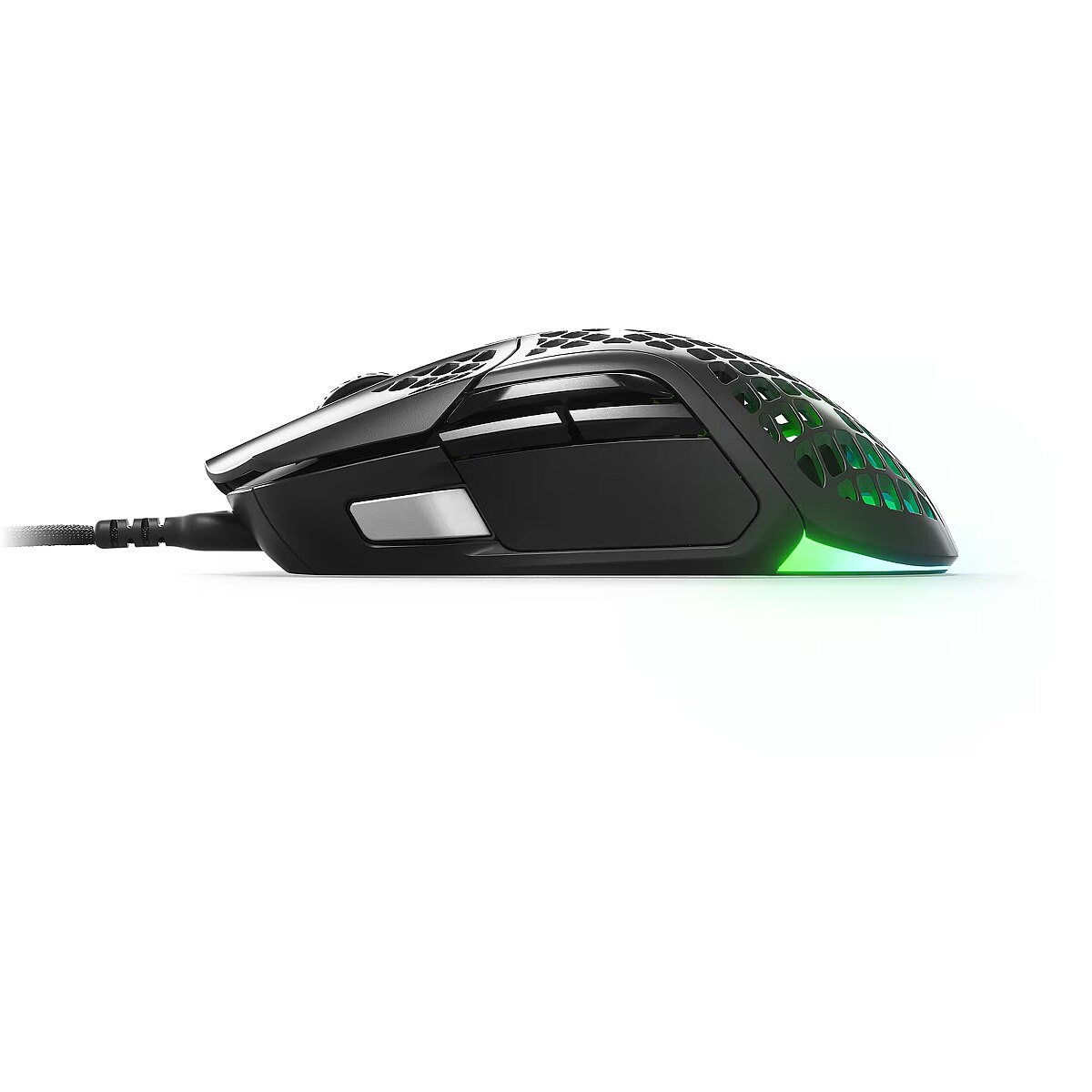 Technical_details - Aerox 5, gaming mouse The ultra-light Aerox 5 gaming mouse from SteelSeries combines a low weight of just 66 g with a state-of-the-art, ergonomic design and maximum speed for an unprecedented gaming experience. With its nine programmable buttons, including five side buttons and a specially designed toggle switch, all macros are always at your fingertips to perform game-changing actions in seconds. IP54 rated AquaBarrier technology protects the Aerox 5's internal circuitry from all environmental influences. The TrueMove Air Sensor offers unrivaled precision, 1:1 tracking and absolute control thanks to up to 18,000 dpi, 400 ips, 40 G acceleration and tilt tracking. The Aerox 5 also features pure PTFE glide feet and a detachable Super Mesh USB-C cable for smooth and precise mouse movements. All adjustments can be conveniently made via the SteelSeries Engine and the 3-zone RGB lighting can be adapted to in-game events or coordinated with other SteelSeries products. Type: Gaming Mouse Color: Black EAN: 5707119044813 Manufacturer number: 62401 Scope of application: gaming Suitable for: PC, Mac, notebook Connection: type | Cable Connection: Connection | 1 x USB Query: type | optical Query: sensor name | TrueMove Air Query: Resolution | 18000dpi Query: speed | 400IPS Query: Acceleration | 40g Query: polling rate | 1000Hz Operation: lifetime | 80 million clicks Operation: keys | 9 pieces Operation: scroll wheel | 1 piece Operation: dpi switch | Yes Operation: Ergonomics | for right-handers Operation: grip position | Claw grip, palm grip Lighting: 3-zone lighting, RGB Software: SteelSeries Engine Material: mouse feet | 100% PTFE Special features: 9 programmable buttons, including 5 side buttons and 1 toggle switch, AquaBarrier technology with protection class IP54, 1:1 tracking, ideal for FPS, MOBA, Battle Royale, MMOs and RPGs, PrismSync lighting, detachable Super Mesh USB-C Cable Supported operating systems: MacOS, Windows Dimensions: Width: 68.2mm x Height: 42.1mm x Depth/Length: 128.8mm Weight: 66 grams