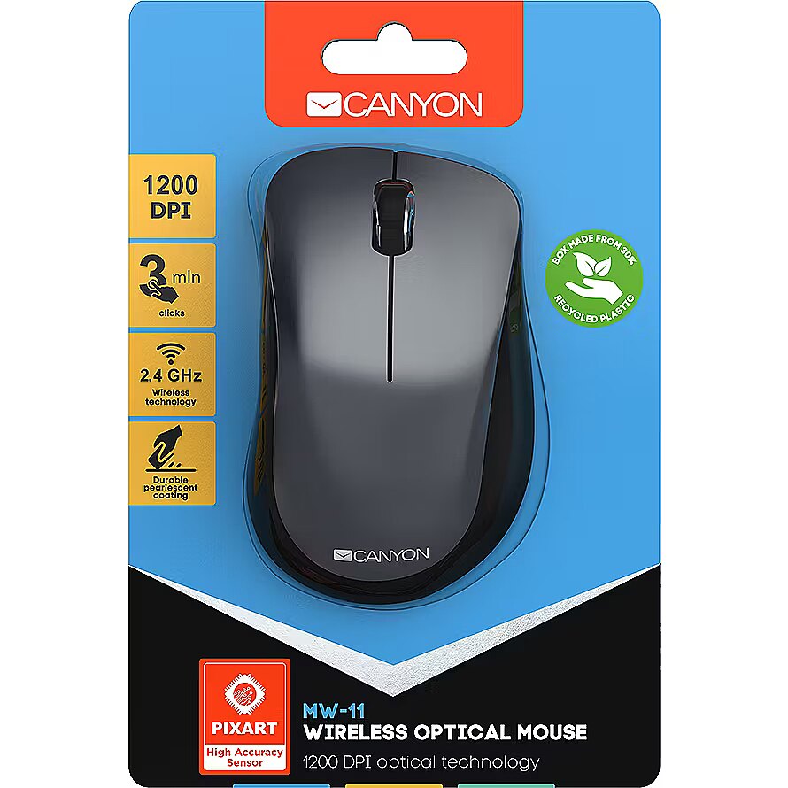 ProductDescription - CANYON MW-11, 2.4 GHz Wireless mouse,with 3 buttons, DPI 1200, Battery:AAA*2pcs,Black,67*109*38mm,0.063kg
