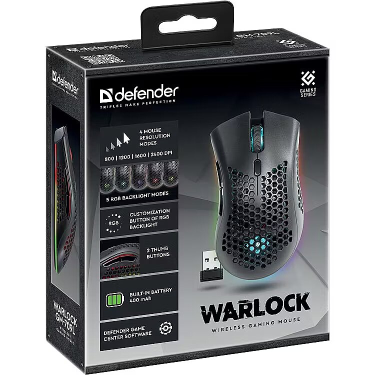 Description - Defender GM-709L Warlock Optic RF RGB 2400dpi 8P Mouse RGB backlighting 5 backlight modes Customisable RGB backlighting Defender Game Center software Wireless mouse Keyboard button emulation Macro editor 4 mouse sensitivity modes 2 side buttons Flicker illumination 5 programmable buttons Built-in battery 400 mAh Charging via USB cable USB cable included