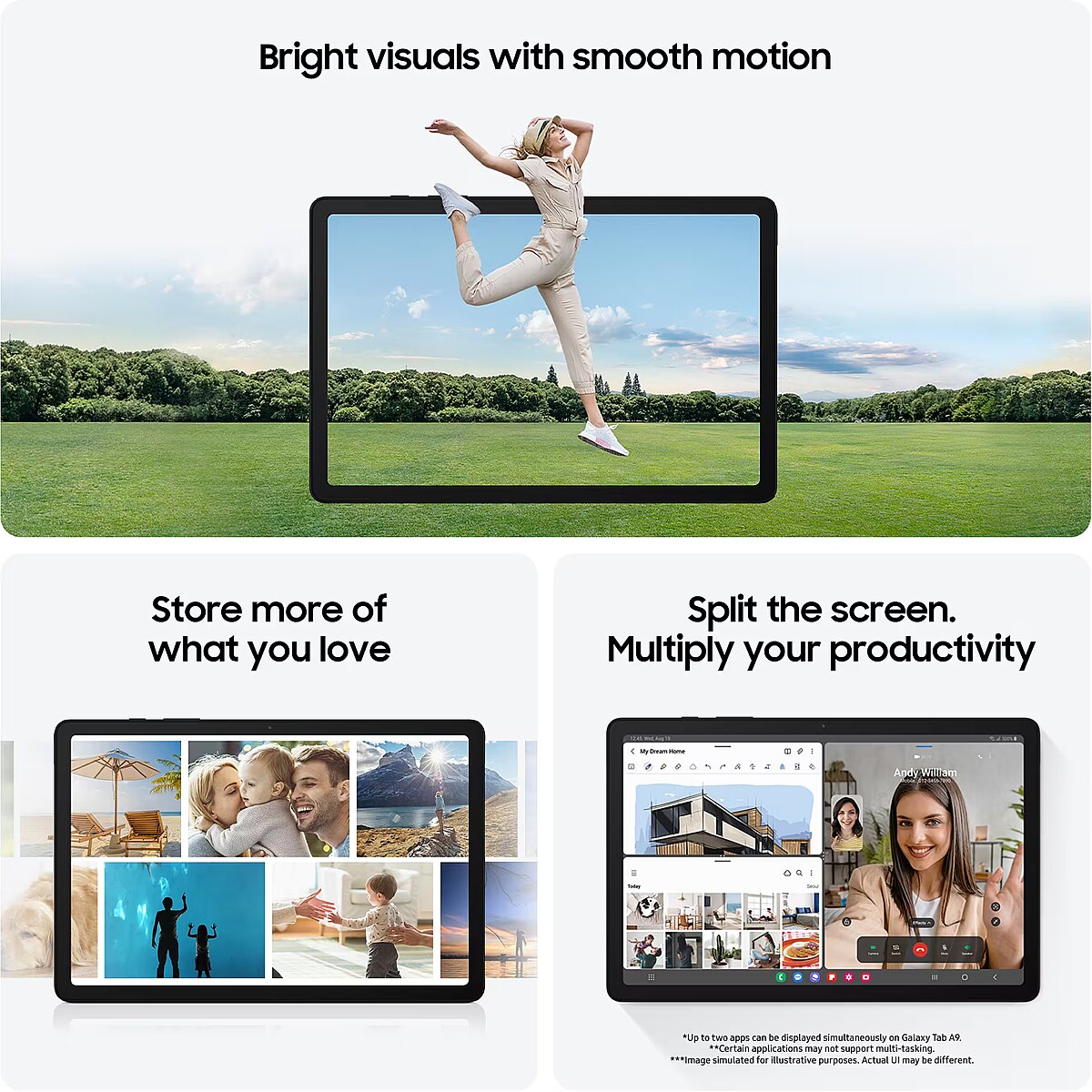 LongDesc - Classic and contemporaryStylish with a touch of cool, the Galaxy Tab A9 and Tab A9+ features a sleek design and a smooth metal body. Enjoy Samsungs signature tablet design in Graphite, Silver and Navy with each hue highlighting effortless charm.Expansive, bright visuals with smooth motionExperience the joy of entertainment on the large, bright display. Galaxy Tab A9+'s high screen refresh rate lets you immerse in the visuals with smooth and fluid motion. Even when you are out in the sun, step into the captivating world of your favorite content.Store more of what you loveGalaxy Tab A9 and Tab A9+ come with up to 8GB of memory, ensuring less lag while you multi-task. Plus, the built-in 128GB storage saves all your hi-res videos, photos and files. You can expand the storage with a microSD card — up to 1TB. Store more of what you love and delete less.Split the screen into three. Multiply your productivityConquer multiple tasks at once. With Galaxy Tab A9+, you can sketch out architectural plans and choose captivating visuals and video chat — up to three apps all on one screen without ever closing a window.Surround yourself with rich audioTake a deep dive into a rich soundscape with speakers that provide an enveloping audio experience. Whether you're enjoying a movie or music, Galaxy Tab A9+ lets you fully engage in 3D sound with stunning clarity and depth.Secure your peace of mindKeep your information safe and sound. Store important data in the Secure Folder and monitor the overall security status of your device on the Privacy Dashboard. Make the most of your Samsung Galaxy experience, worry-free of security issues.