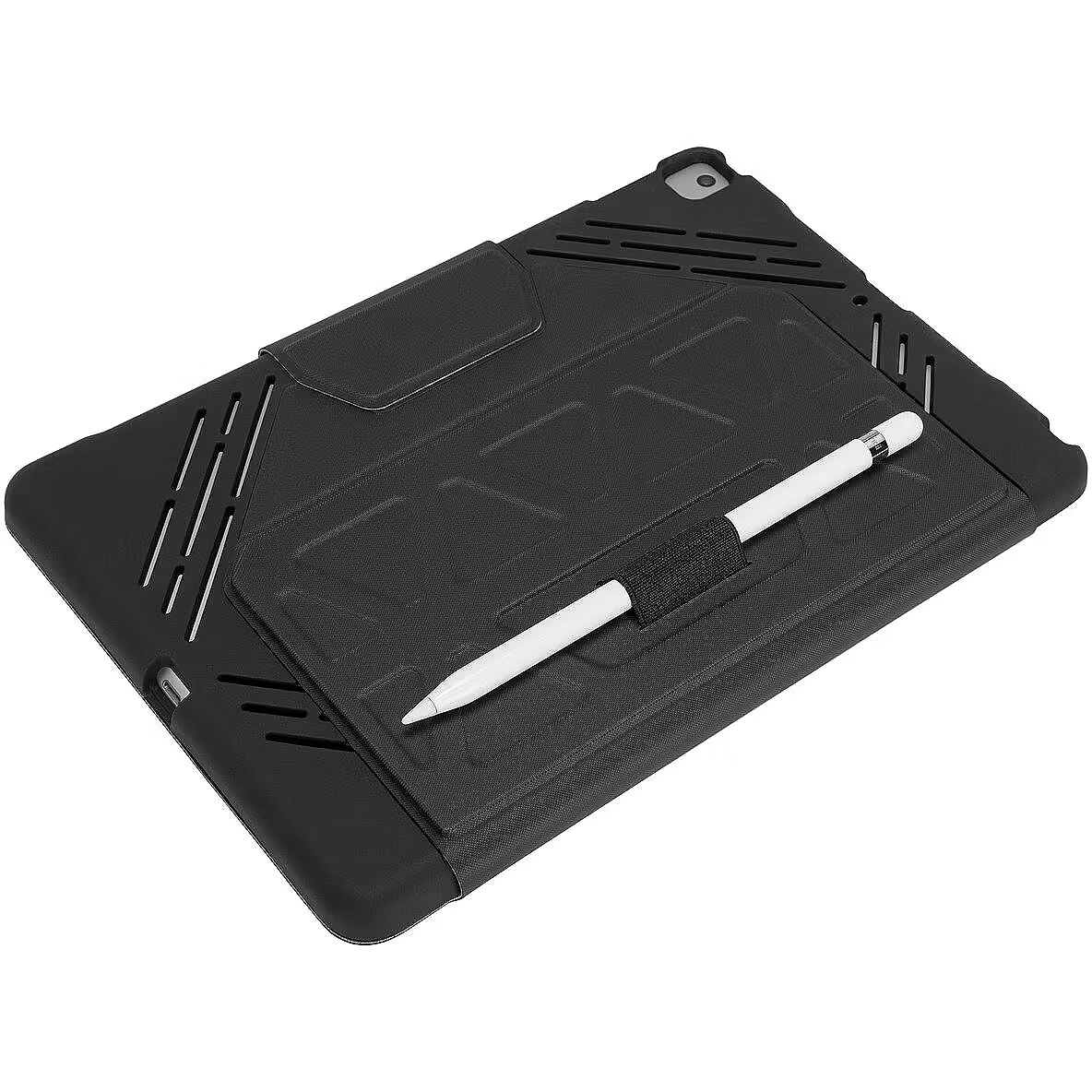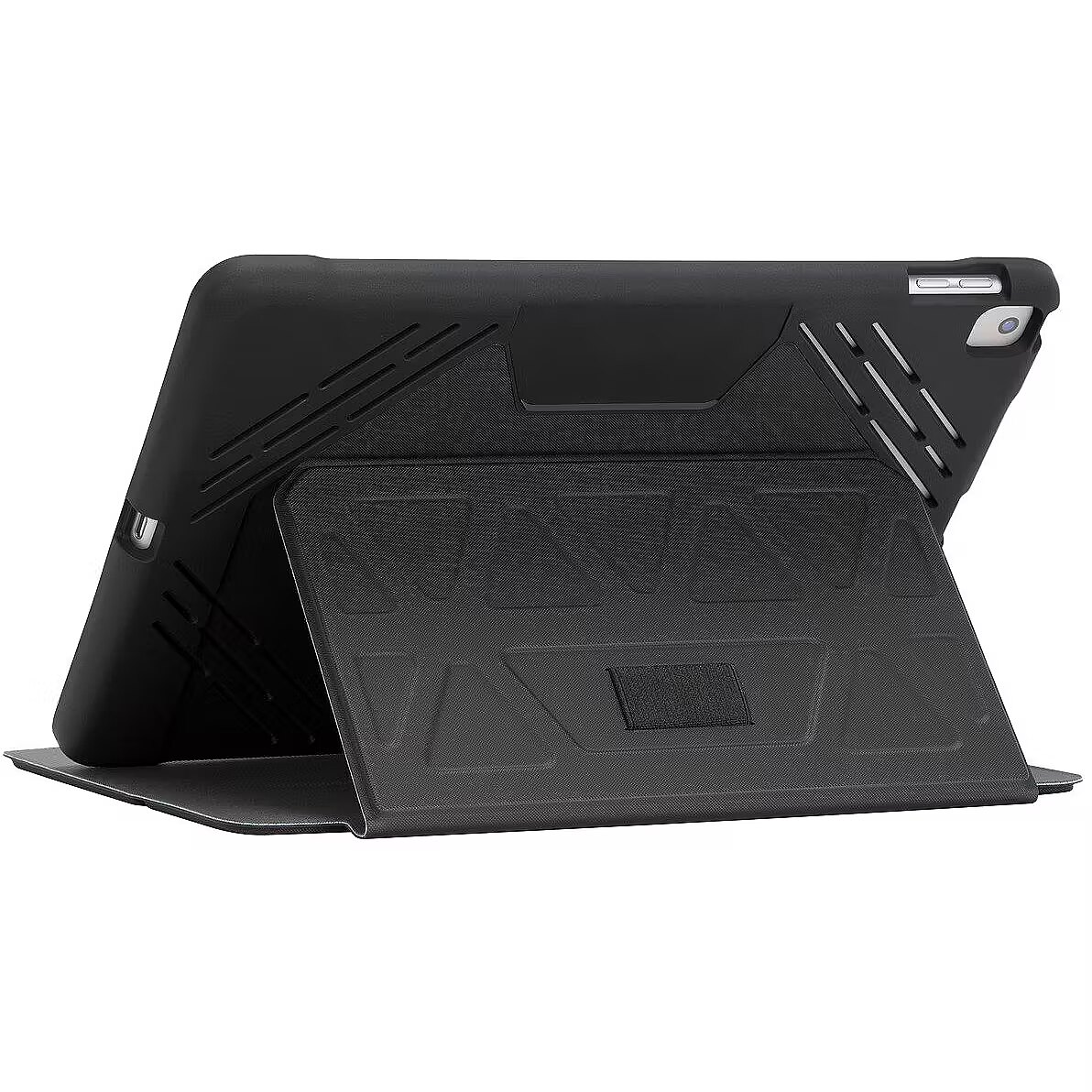 LongDesc - Wrap your iPad® (7th gen.) 10.2-inch in strong, military grade drop protection*. Engineered for durability without adding weight, this architectural case features a flexible tray with wrap-around bezel and reinforced corners to ward off bumps and dings. The patent-protected tray design also flexes to fit iPad Air® 10.5-inch and iPad Pro® 10.5-inch for a snug, safe fit. It is also structurally designed to redirect sound for enhanced audio. Precision cutouts give full access to controls, ports and cameras. Convenient sleep/wake feature reduces downtime and conserves the battery.The structured cover is engineered to protect, while a non-slip interior makes it easy to adjust your iPad into infinite viewing angles or a comfortable typing position. Altogether, it’s a superior choice for protecting your iPad.
