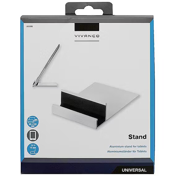 description_en - The compact aluminium stand is adequate for all tablet computers with a maximal thickness of 15mm (e.g. Apple iPad, Samsung Galaxy). Thanks to the anti-slip inferior part and the inlay equipped with anti-scratch protection the tablet computer has a safe and protected position inside the support - no matter if the orientation is horizontal or vertical (it is recommended to insert a max. 7" / 17.8cm display when using vertical orientation). The elegant design and high quality material are a real eye-catcher on the desktop - even without a tablet computer inserted. For tablets with max. 15 mm thickness Footprint of 99 x 102 mm Only 27 mm high Anti-slip bottom surface Anti-scratch inlay