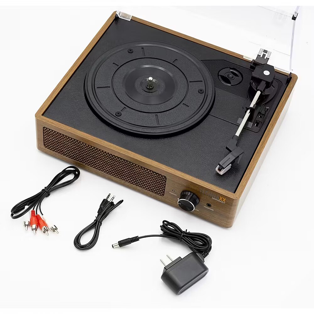 Description - Gramofon Retro z Bluetooth Technaxx Obsługa Bluetooth V5.0 Głośniki stereo 2 x 3W Wyjście RCA do podłączenia systemów HiFi Odtwarzanie płyt winylowych z 3 prędkościami: 33, 45, 78 obr./min Digitalizacja bezpośrednio na dysk USB Wejście AUX-IN 3,5 mm i gniazdo słuchawkowe 3,5 mm Wysokiej jakości konstrukcja z funkcjonalną obsługą Dane techniczne Bluetooth V5.0; zasięg ~10m tereny otwarte Częstotliwość nadawania Bluetooth 2,4 GHz; Wypromieniowana moc wyjściowa maks. 2,5 mW Tryb Phono, Bluetooth, wejście AUX, USB Głośniki 2x 3W głośniki stereo, impedancja 4, pasmo przenoszenia 75Hz-20kHz Gramofonowe EP/LP/SP; silnik prądu stałego; prędkości: 33/45/78 obr./min; S/N§45dB; wkład z igłą (ID modelu: 4768); napęd paskowy Gniazdo AUX-IN i słuchawkowe 3,5 mm Wejście AUX / gniazdo słuchawkowe: 3,5 mm Wyjście RCA Cinch (lewe i prawe) Napięcie zasilacza 100-240V 50/60Hz Wejście zasilania DC 5V 1A Pobór mocy Maks. 5W