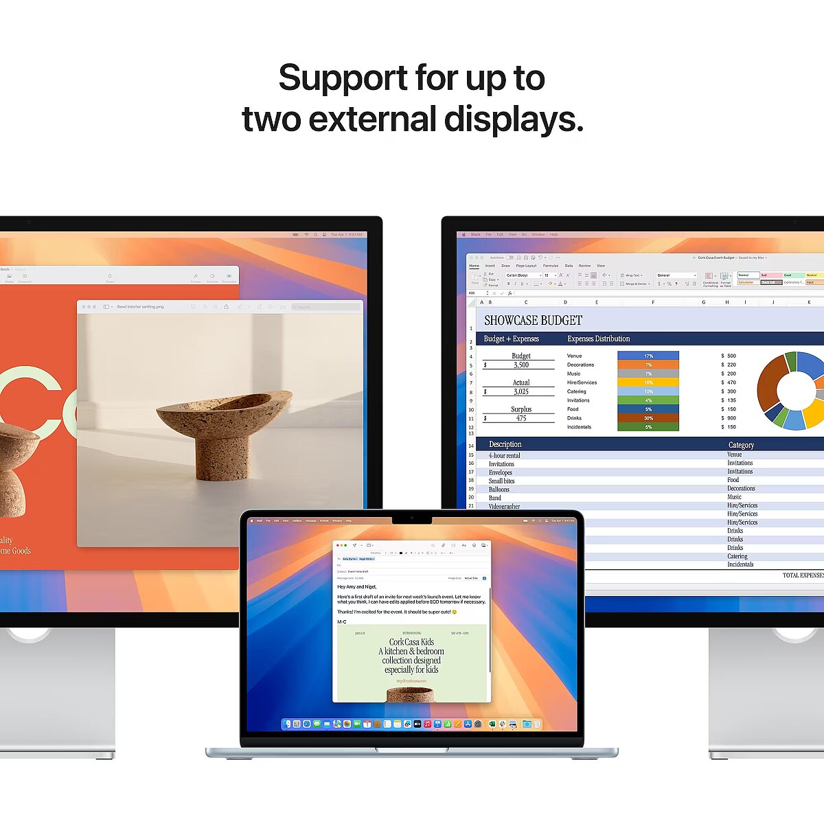 Technical specifications > Display - Liquid Retina display 13.6-inch (diagonal) LED-backlit display with IPS technology;2 2560-by-1664 native resolution at 224 pixels per inch 500 nits brightness Color Support for 1 billion colors Wide color (P3) True Tone technology Simultaneously supports full native resolution on the built-in display at 1 billion colors and: Up to two external displays with up to 6K resolution at 60Hz Thunderbolt 4 digital video output Support for native DisplayPort 1.4 output over USB-C