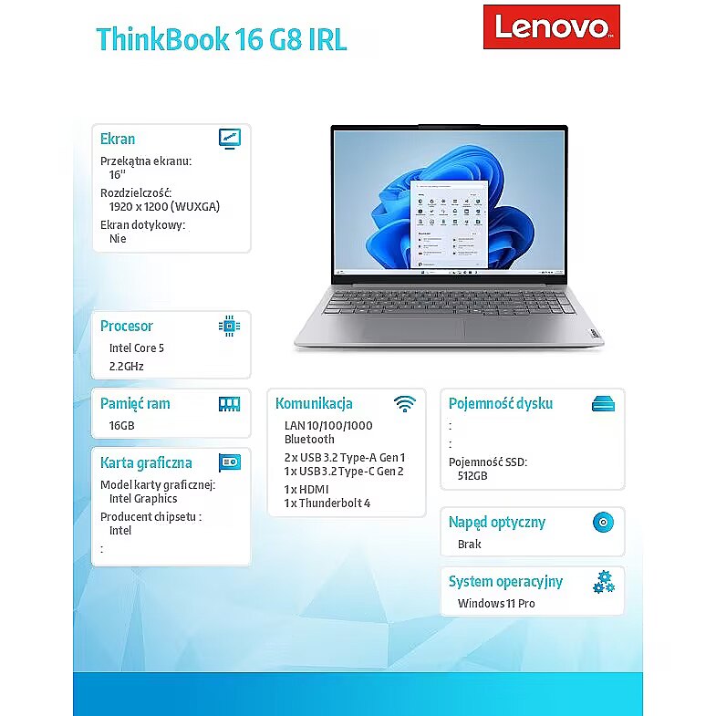ShortSummaryDescription - Lenovo ThinkBook 16 G8 IRL, Intel Core 5, 40.6 cm (16"), 1920 x 1200 pixels, 16 GB, 512 GB, Windows 11 Pro