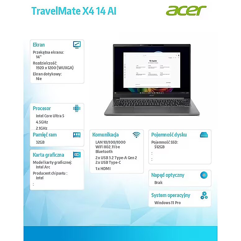 Description - Laptop Acer TravelMate X4 14 AI o wadze około 1,27 kg i grubości 15,9 mm został zaprojektowany z myślą o profesjonalistach, którzy dużo podróżują i chcą pracować zdalnie bez pogorszenia wydajności. Jego stylowy wygląd sprawia profesjonalne wrażenie.