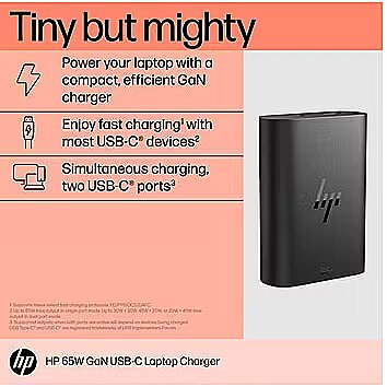 LongSummaryDescription - HP 65W GaN USB-C Laptop Charger. Purpose: Laptop, Power supply type: Indoor, Output power: 65 W. USB connector type: USB Type-C. Product colour: Black. Compliance certificates: CCC, Federal Communications Commission (FCC), CE. Sustainable technologies and materials: Outside box and corrugated cushions are 100% sustainably sourced and recyclable; 30% post-consumer...