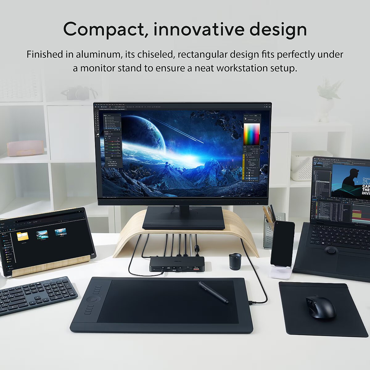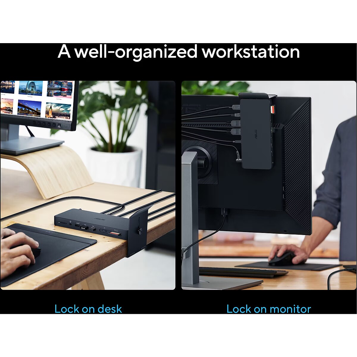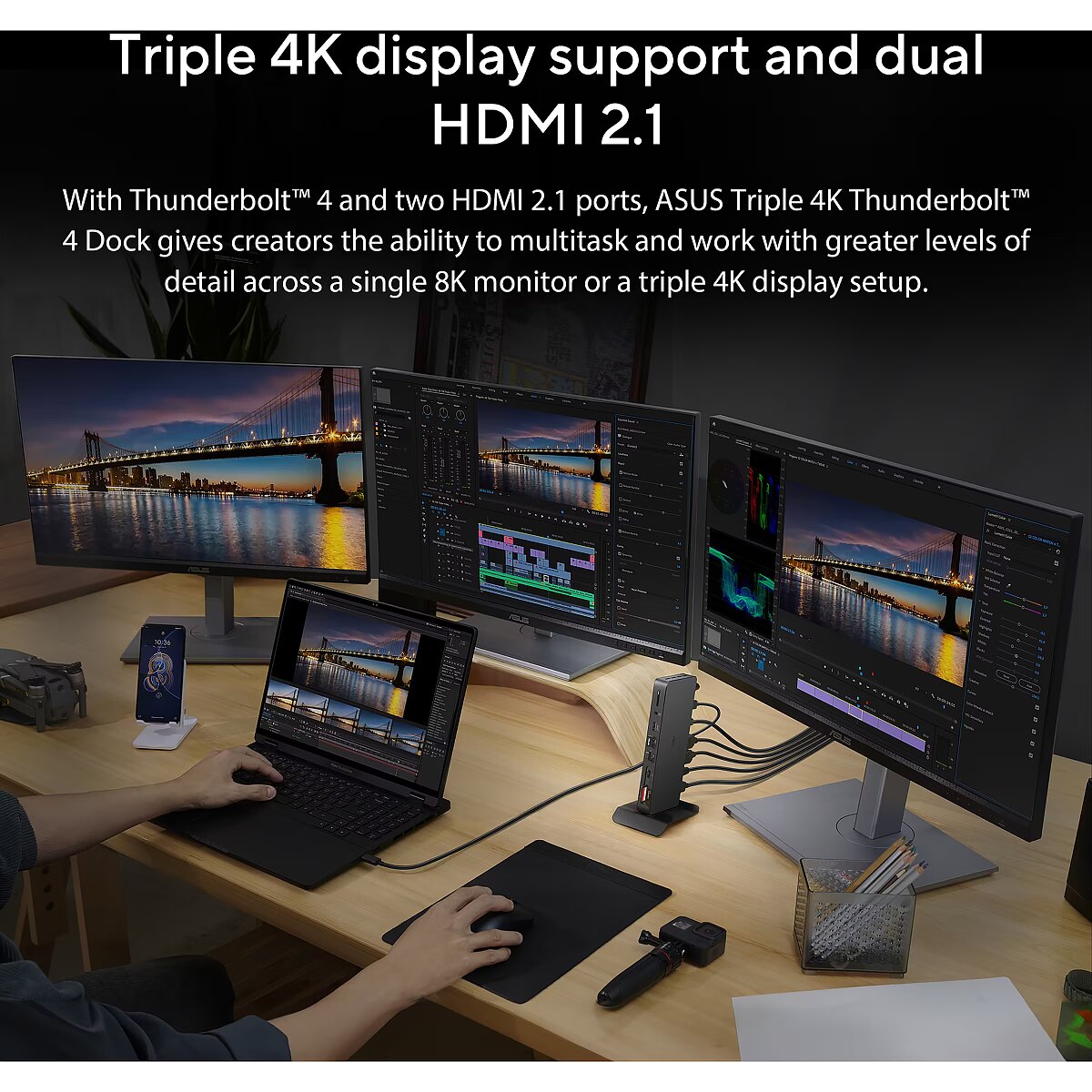 LongDesc - Compact productivity magicASUS Triple Display USB-C Dock is a sleek, compact one-stop device that streamlines laptop connectivity. Power your laptop through a single cable, connect to your network and peripherals, and multitask with up to four monitors — including a laptop monitor and three external monitors. It also has an integrated SD card reader for a diverse array of business scenarios. Simply put, ASUS Triple Display USB-C Dock keeps your desk neat, tidy and organised while setting you up for work in the blink of an eye.