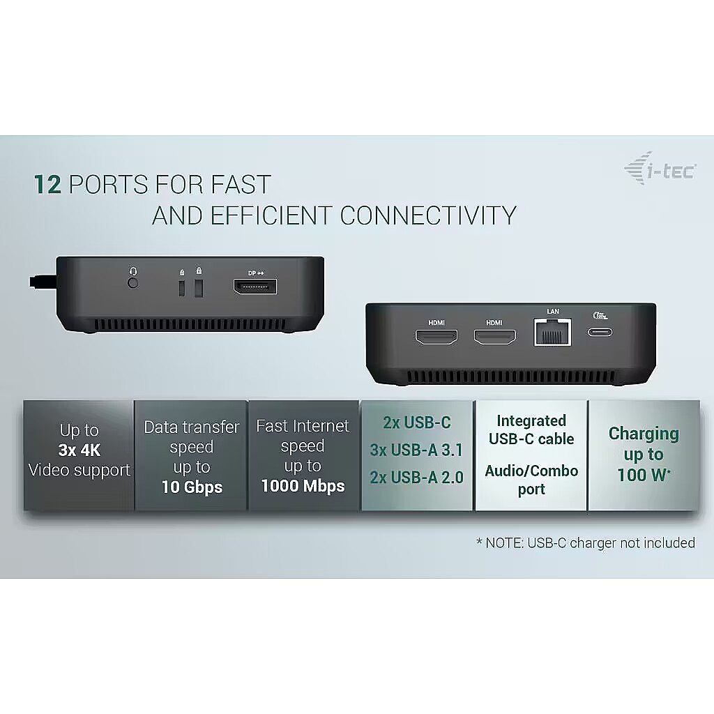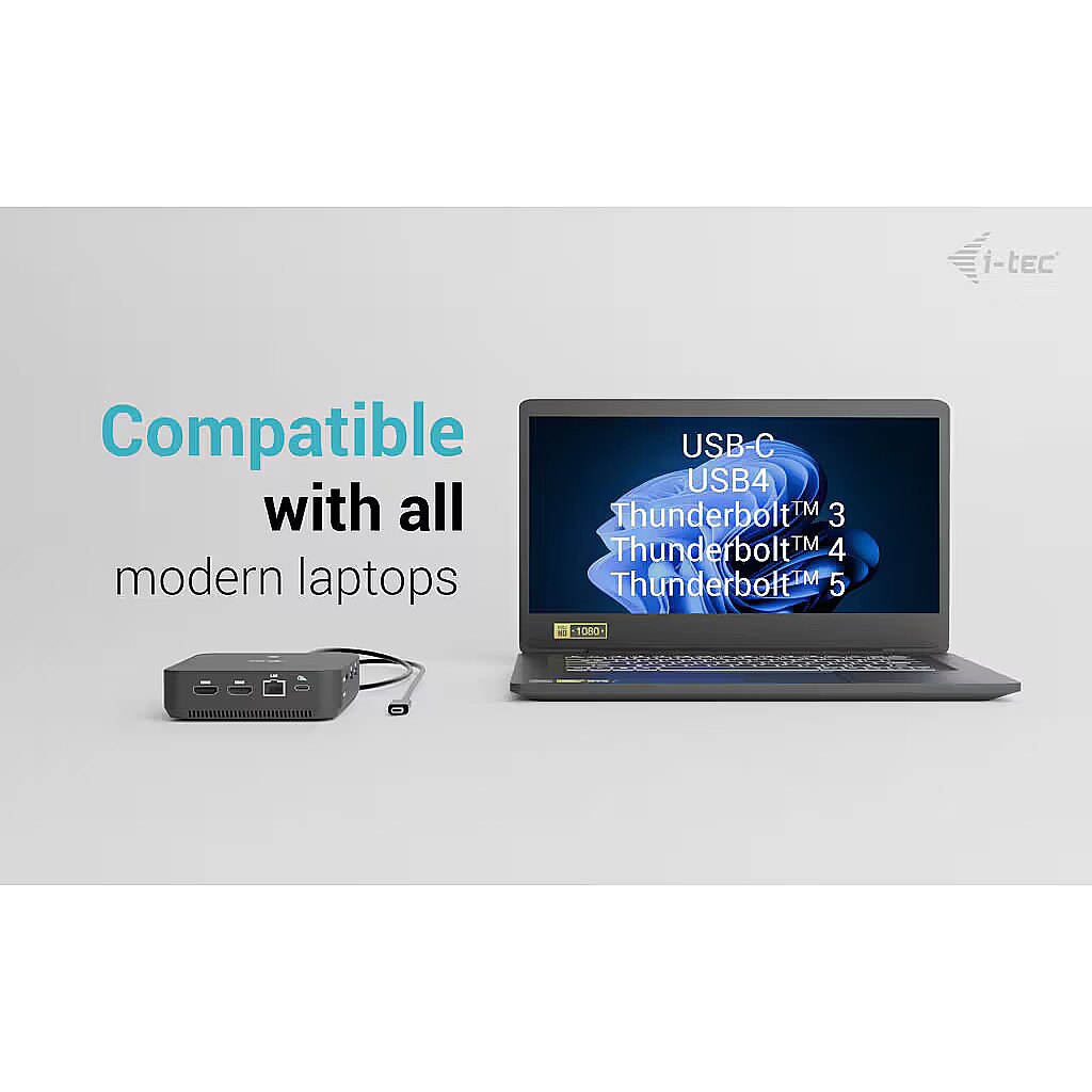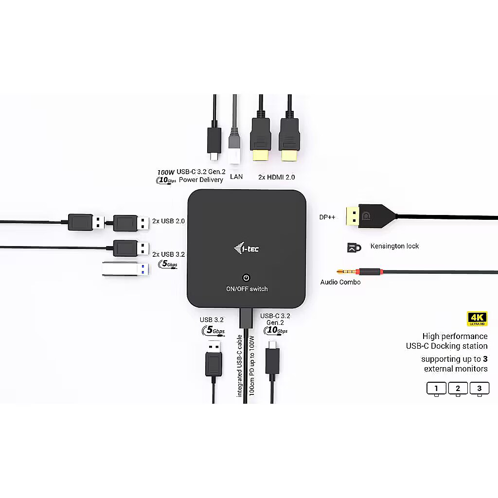 Description - Kompatybilna z laptopami i tabletami wyposażonymi w porty USB-C, USB4 oraz Thunderbolt. (Urządzenie hosta musi obsługiwać tryb DisplayPort Alt. Mode) 2× HDMI i 1× DisplayPort++ z obsługą do trzech monitorów 4K lub jednego monitora 5K/60 Hz (w zależności od wydajności notebooka). macOS obsługuje tylko jeden rozszerzony ekran. 6× portów USB (5× USB-A, 1× USB-C) umożliwia łatwe podłączenie wielu urządzeń i akcesoriów USB. Obsługuje Power Delivery do 100 W dla kompatybilnych laptopów i tabletów z USB-C, USB4 i Thunderbolt. Urządzenie hosta musi obsługiwać Power Delivery przez USB-C. GLAN Ethernet obsługuje prędkości sieciowe 10/100/1000 Mb/s, zapewniając stabilne i szybkie połączenie z internetem. Złącze combo audio 3,5 mm (wejście/wyjście) umożliwia łatwe podłączenie zestawu słuchawkowego lub głośników. Uchwyt VESA pomaga utrzymać porządek na biurku i ograniczyć ilość kabli, a gniazdo K-lock zapewnia dodatkowe zabezpieczenie. Przełącznik zasilania On/Off pozwala zmniejszyć zużycie energii, gdy stacja dokująca nie jest używana. Uwaga: Zasilacz nie jest dołączony. Stację dokującą można zasilać oryginalnym zasilaczem laptopa lub dokupić opcjonalny zasilacz (kod produktu i-tec: CHARGER-C100W).