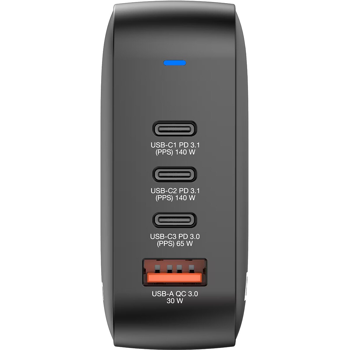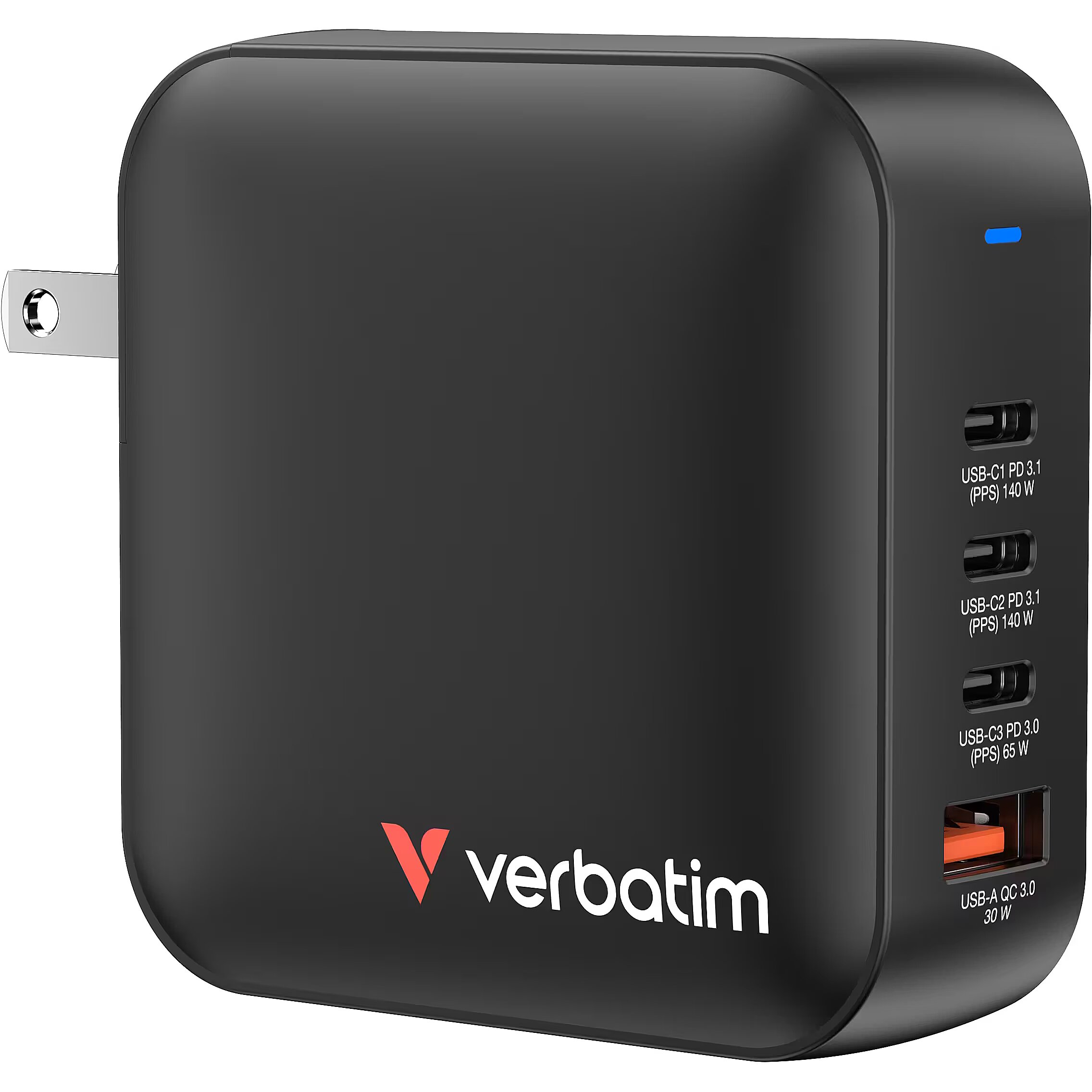 LongDesc - 4-in-1 ChargingVerbatim's 165W Mini GaN Charger combines three USB-C® and one USB-A port into a compact, pocket-sized design. Capable of charging up to 4 devices simultaneously, the USB-C ports support PD 3.1 (Power Delivery) at 140W and PD 3.0 at 100W and 65W respectively while the USB-A port supports QC 3.0. Ideal for the office, home or travelling to power your laptop, tablet, smartphone, gaming devices, and more.With its foldable US prongs and replaceable EU and UK plugs, it’s the ultimate travel companion.Advanced GaN TechnologyGalliam Nitride (GaN) technology delivers high-powered, fast, efficient charging, and generates less heat. GaN chargers are smaller and lighter than traditional silicon-based chargers, making them ultra-portable and ideal for travel.Verbatim Mini GaN Chargers feature an advanced chipset that allows for an even more compact design than regular GaN chargers without sacrificing power. This innovative technology not only reduces the charger's size but also minimises heat generation, delivering safer and more efficient charging in a portable form factor.Safe and ReliableThe Mini GaN charger is made with high-quality, flame-resistant materials and features four safety protection systems, including over-current protection, over-voltage protection, short circuit protection, and over-temperature protection to ensure your safety while charging.