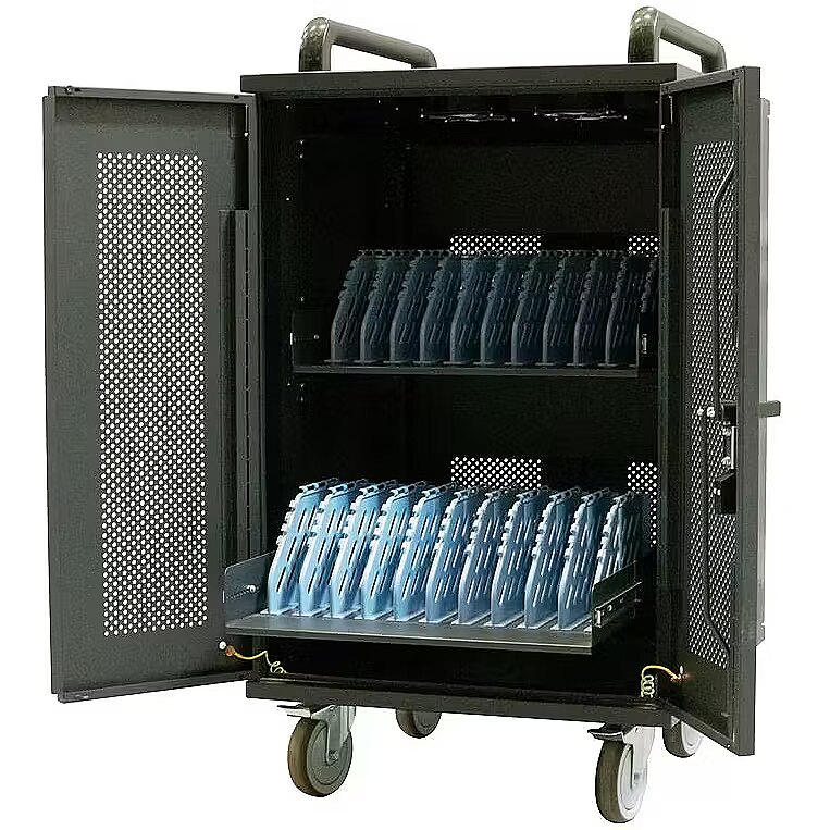 Capacity: 20 laptops/tablets up to 15.6". Sequential charging, voltage protection Lockdown Built-in cable organiser Pull-out drawers with appliances Power supply lockers Rubber castors with locking device Handles to facilitate transport