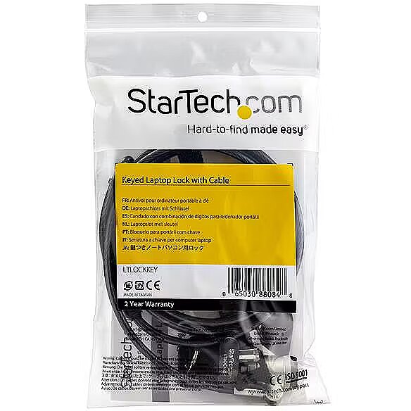 LongDesc - Portable Security Cable | 2 m (6.5') Steel CableEasily protect your laptop or other device against theft, using this keyed cable lock. With a convenient push-to-lock function and no combination required, the steel cable laptop lock maximizes security at the office or on the go.Convenient Push-to-Lock FunctionSave time every day with the push-to-lock button. Just one press and the lock is set. Plus, for convenient operation, the cable joint swivels 360 degrees.No Combination RequiredEasily lock and unlock the laptop cable with the provided keys. Two identical keys are provided, to ensure you always have a spare.Maximize SecurityEnsure that your laptop, tablet, dock, smartphone or other device is anchored safely to your workspace. This keyed cable lock features a durable zinc-alloy lock head. To provide dependable theft protection in a wide range of retail, commercial, and institutional environments, the 2 m (6.5'.) locking cable is compatible with laptops or other devices equipped with the industry-standard Kensington lock slot (K-Slot).Versatile UseIdeal for portable use or at the office, the computer cable lock features a strong vinyl-coated steel cable (4.4 mm diameter). To secure your device in a variety of different work spaces, the flexible steel cable bends easily to loop around a stationary post or object.The TAA compliant LTLOCKKEY is backed by a StarTech.com 2-year warranty and free lifetime technical support.The StarTech.com Advantage
