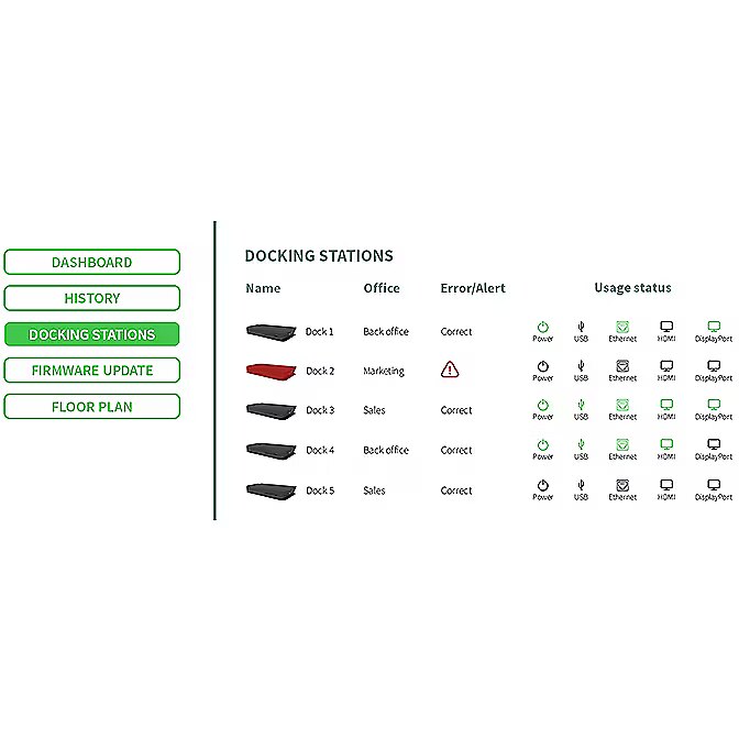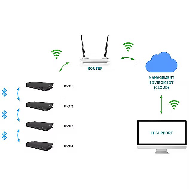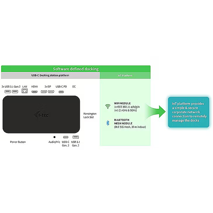 LongDesc - The first docking station with full remote management capability. The docking station is equipped with an IoT (Wifi and Bluethooth Mesh) module that can be connected to a corporate network and remotely control the docking station, including installing software updates, remote power on and off, controlling individual ports and monitoring status.The docking station can be used by the user (like any other docking station) right out of the box, without any installation. Remote management integration can be done at any time, even later (remote management software license and installation is required).The remote management docking station solution offers the possibility of significant time savings in management, as well as energy savings (for example, the docking station can be remotely switched off when not in use). Overall, this can reduce operating costs, which can be lower in an enterprise environment than operating and managing conventional docking stations.The USB-C docking station itself supports the connection of up to three external monitors, 4 USB devices (all USB ports can transfer data at speeds of up to 10 Gbps), Internet connectivity is available thanks to the integrated LAN port, and last but not least, a combined audio and microphone port is available.The docking station can charge a connected laptop or tablet up to 65W and supports installation behind a monitor (thanks to the separately supplied VESA mount).